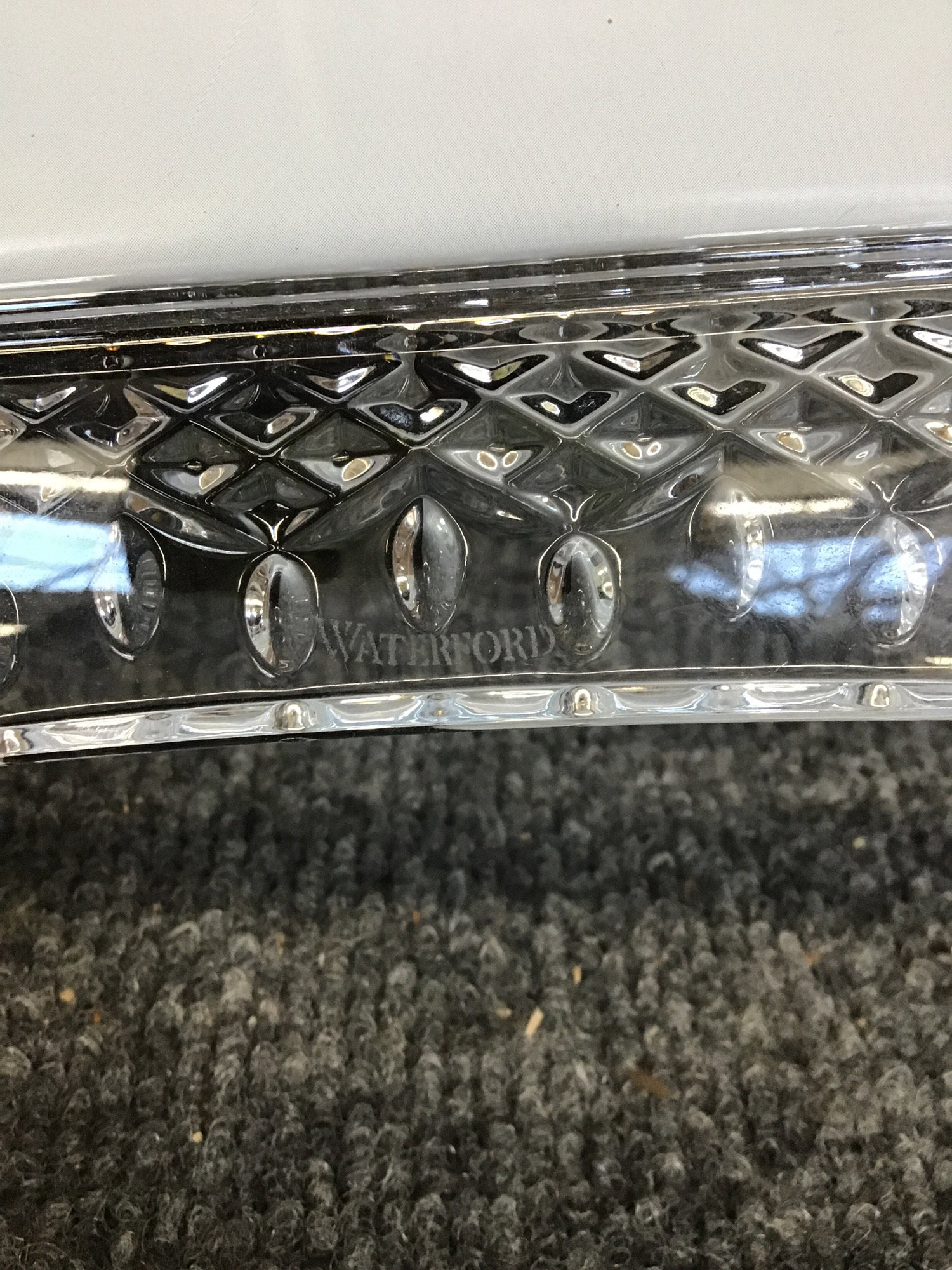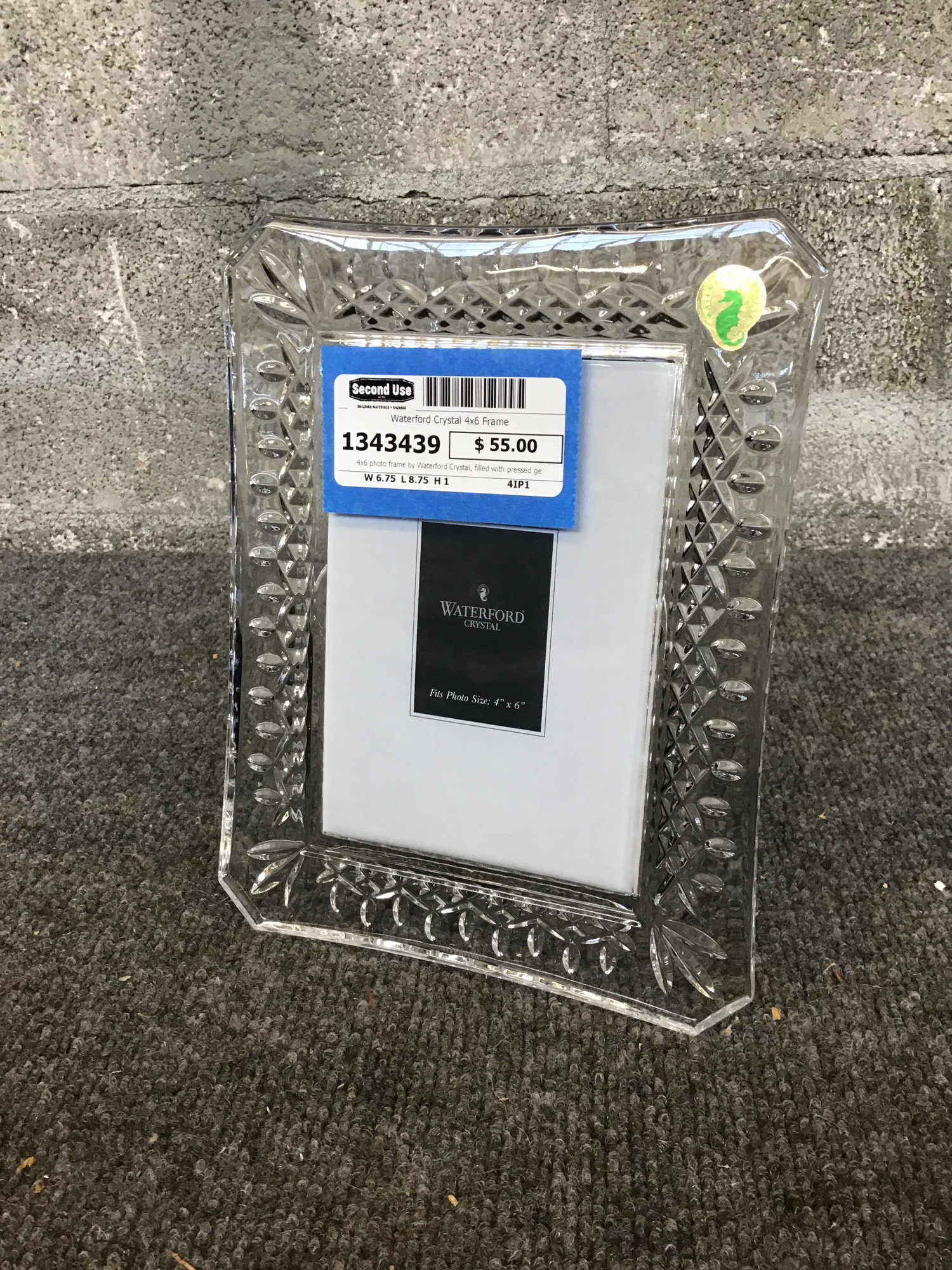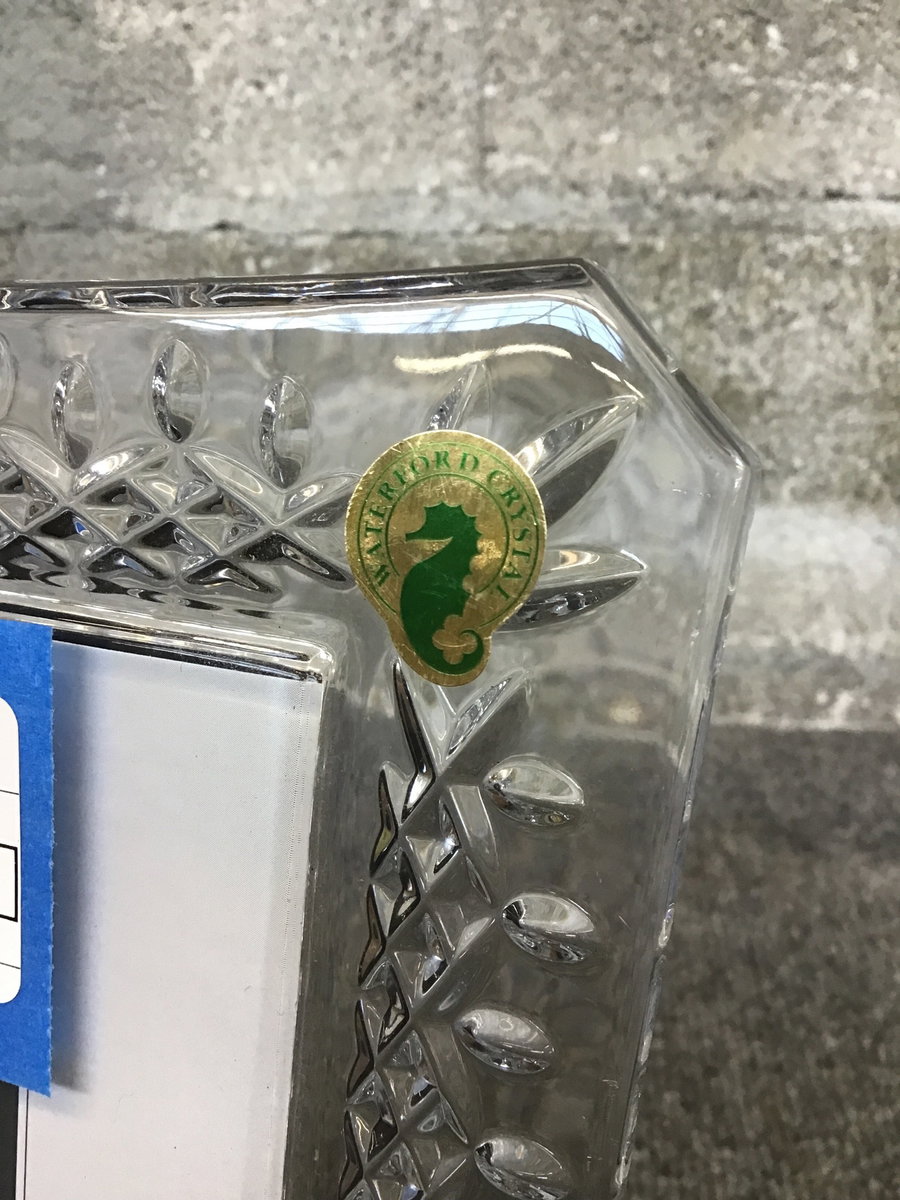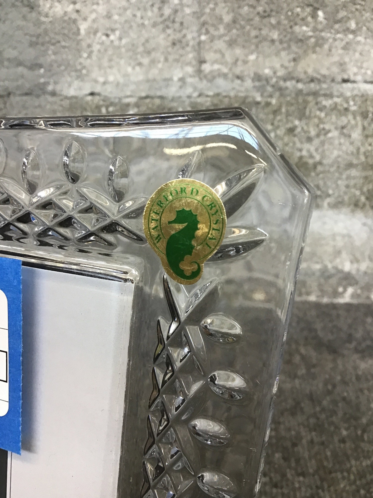 4x6 photo frame by Waterford Crystal, filled with pressed geometric shapes along the border. Still has its sticker and is marked "Waterford" on the bottom.
