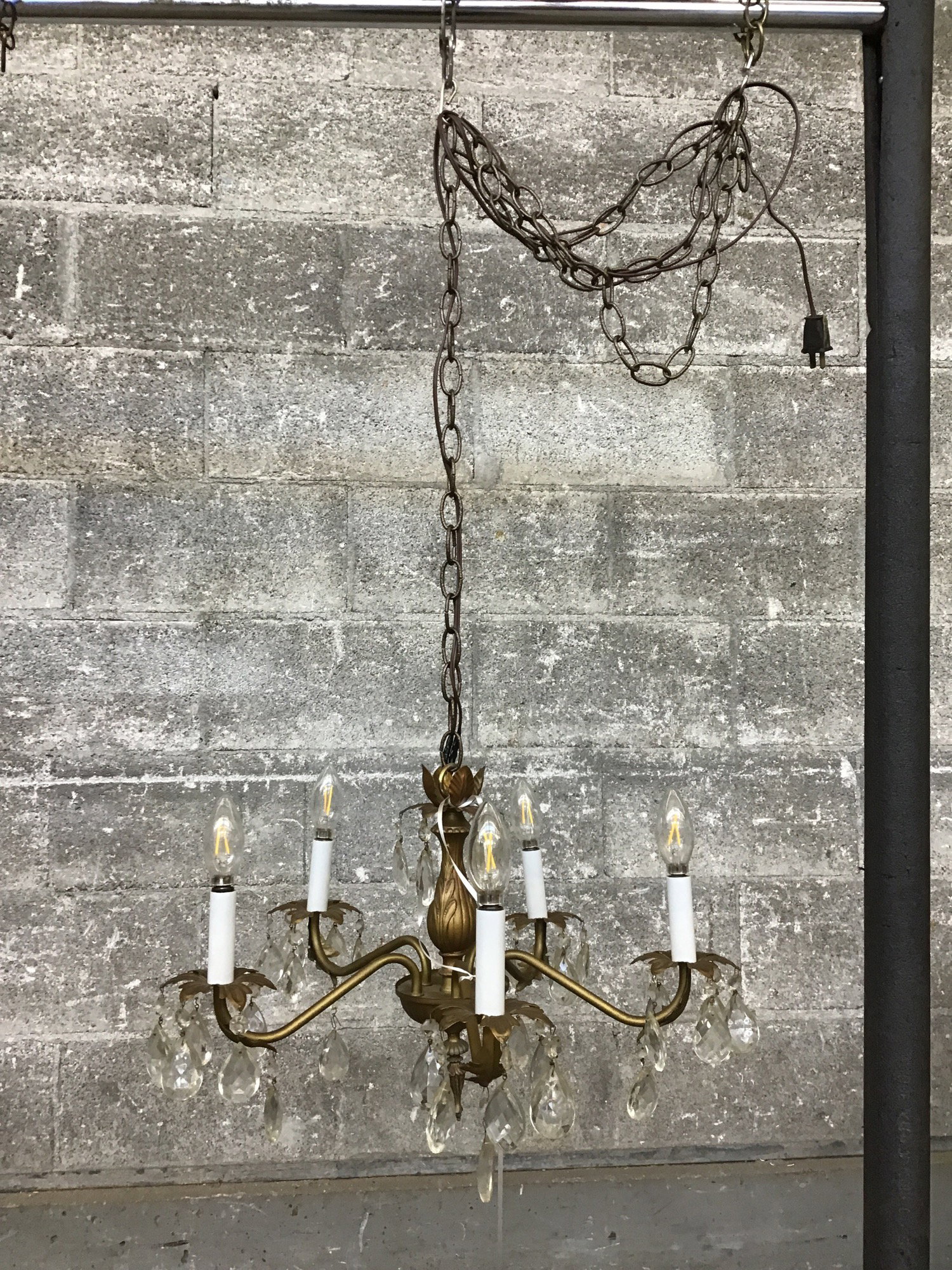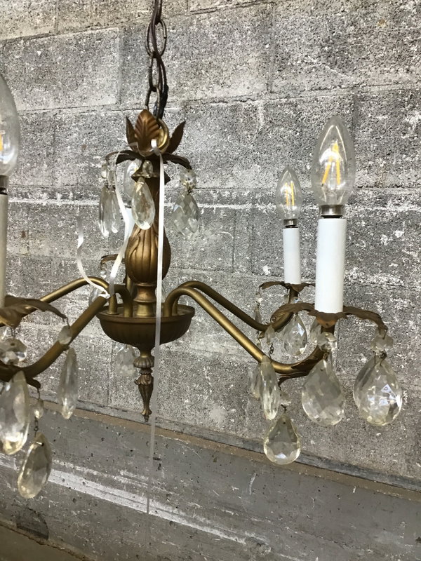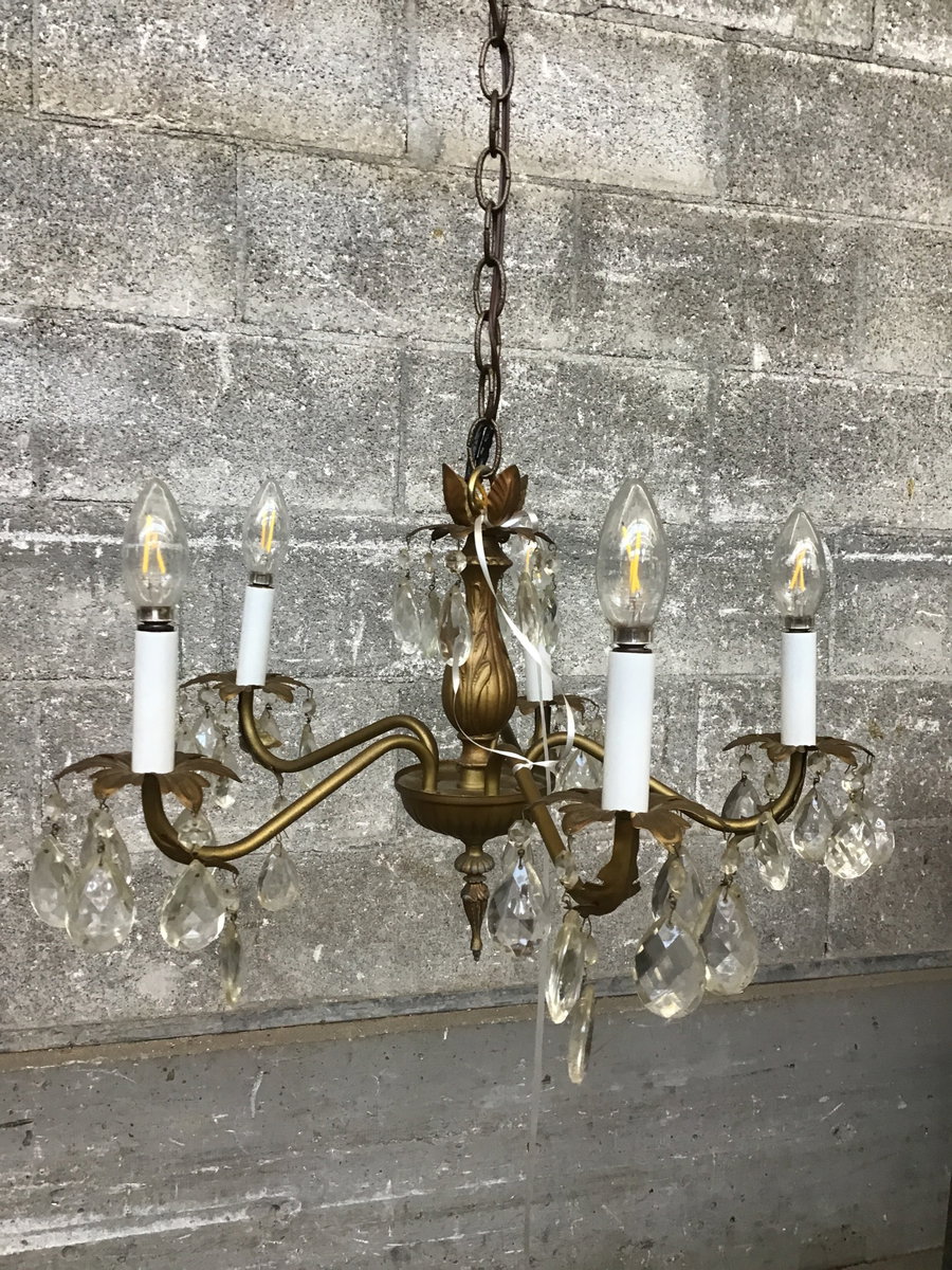 Vintage 5 arm chandelier. Simple brass body with crystals. Currently wired to a plug in cord. Learn more about our light rewire services here if you'd like to get it rehabbed.