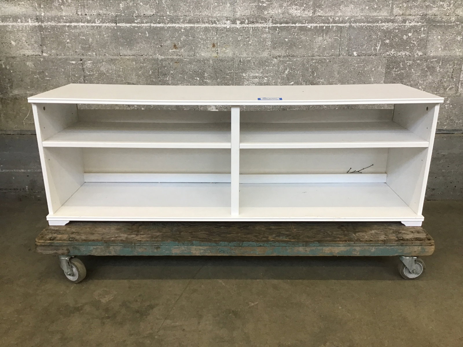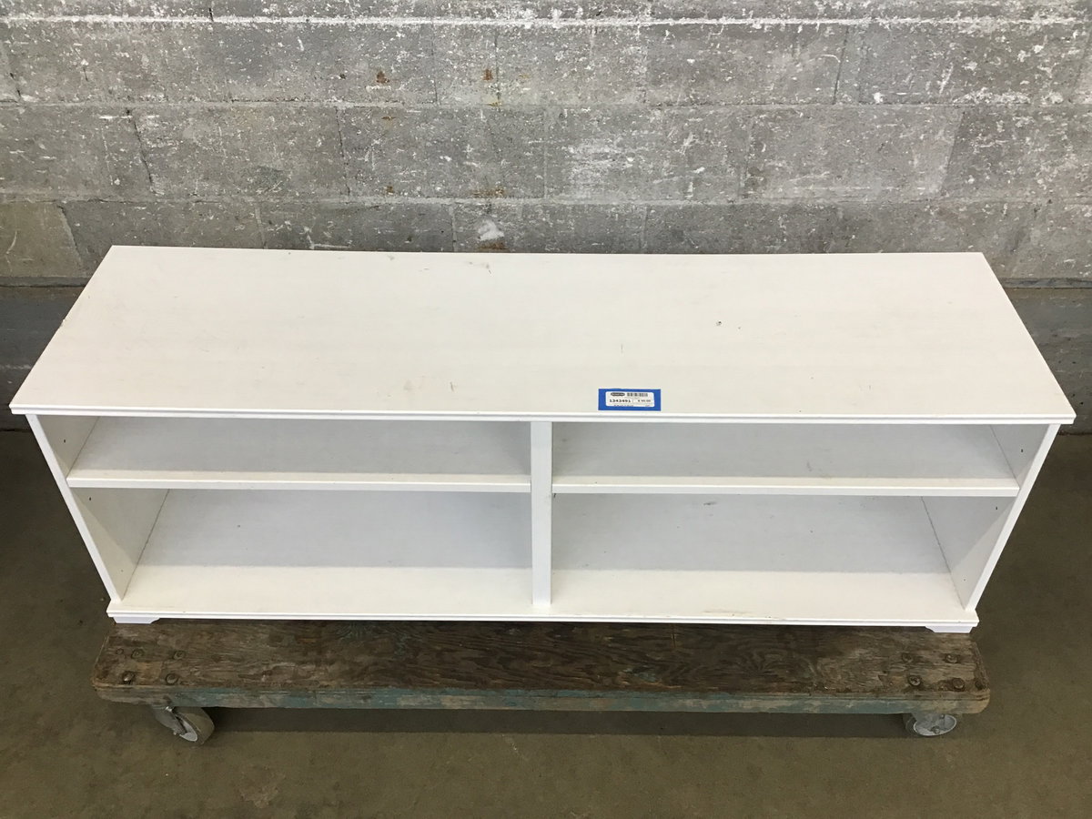 5' Bench constructed from particle board with a white painted finish and cubby space underneath. It's not the most beautiful bench I've ever seen, but it'd be great for a mud room.