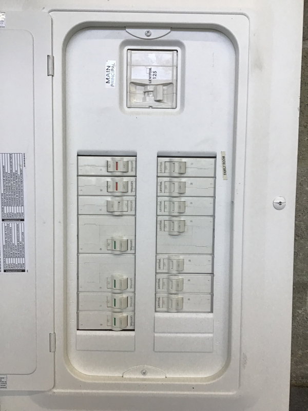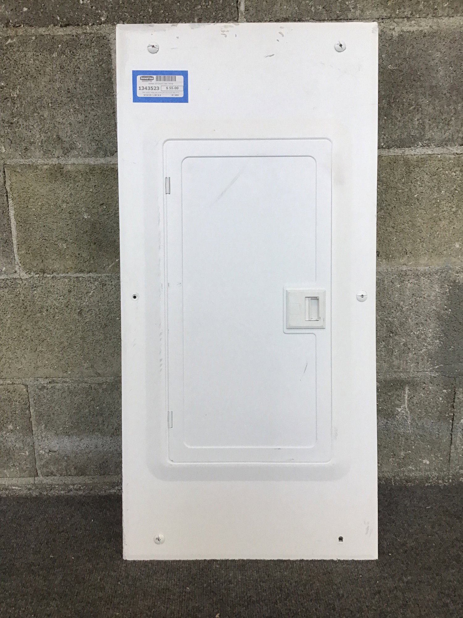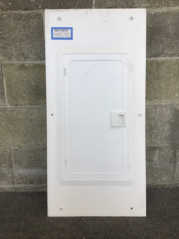 Used Leviton indoor load center with 20 circuits, with 14 currently in use. Several holes have been punched but still in reusable condition. Dimensions listed are rough-in measurement, face measures 15.5W x 32H.