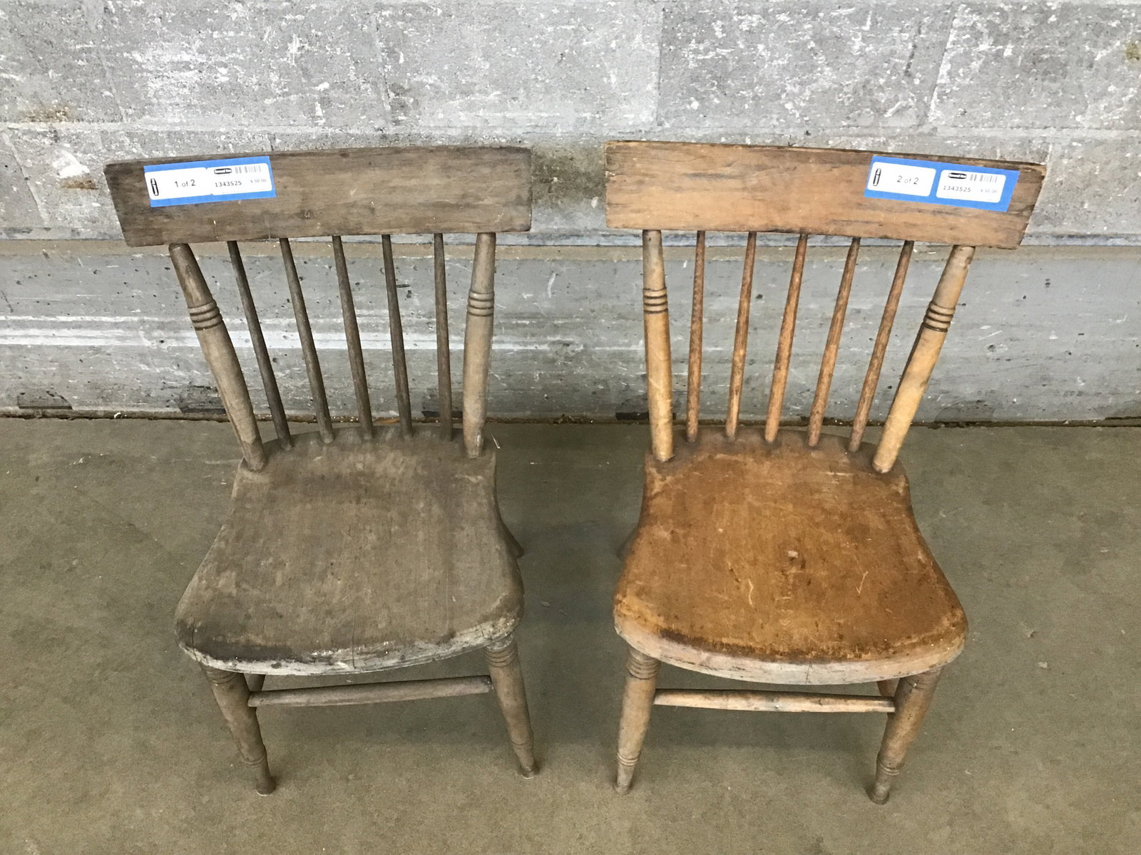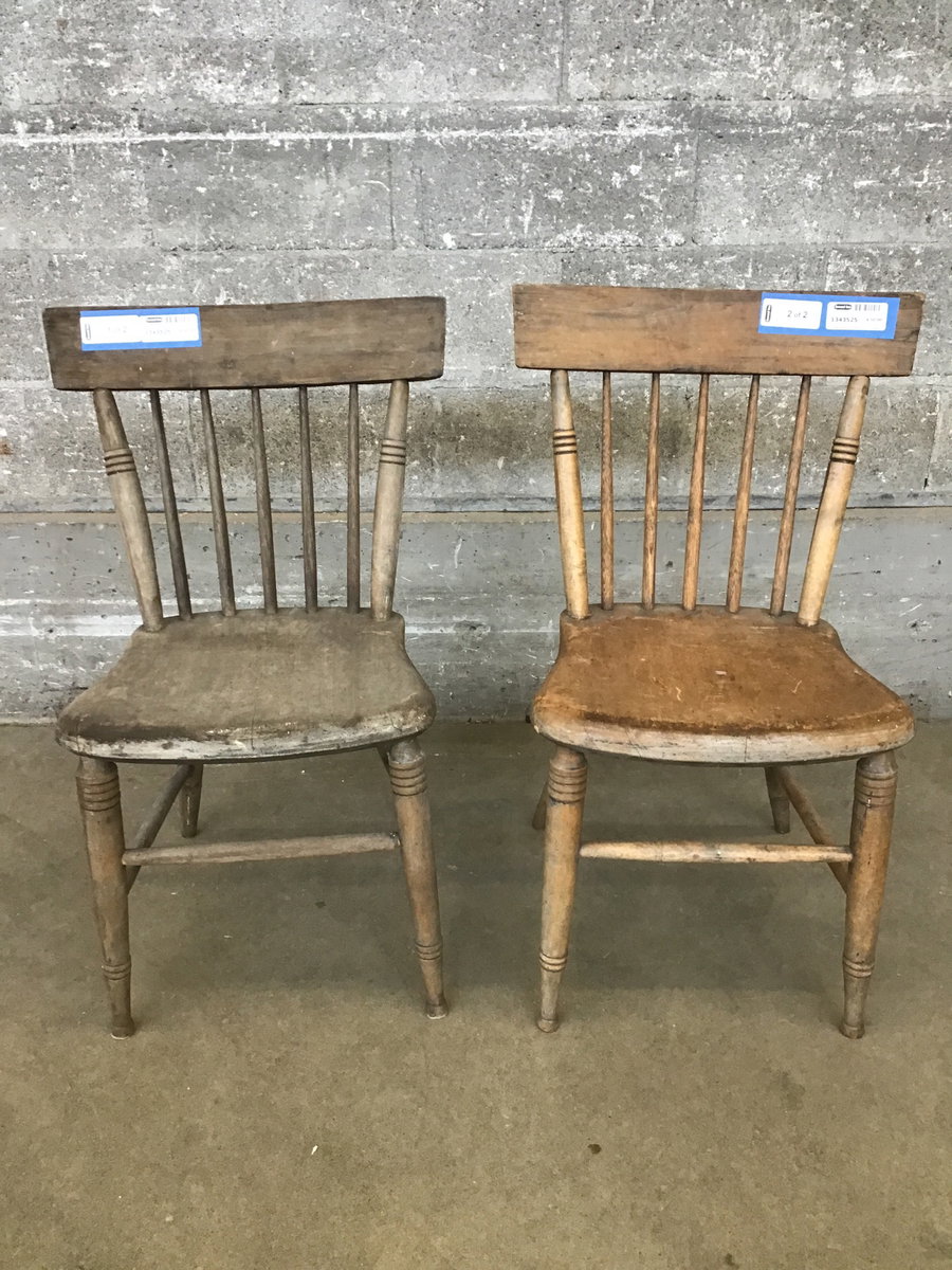 Pair of timeless oak dining chairs with delicate spindles, turned legs and firm yet comfortable seats. With a light sand and a fresh clear coat these could really look stunning. Seat height measures 17.75".