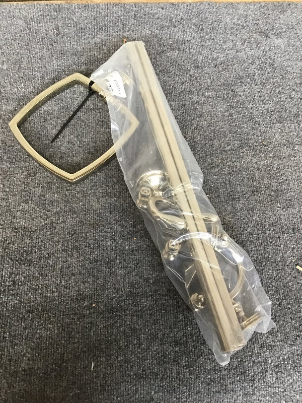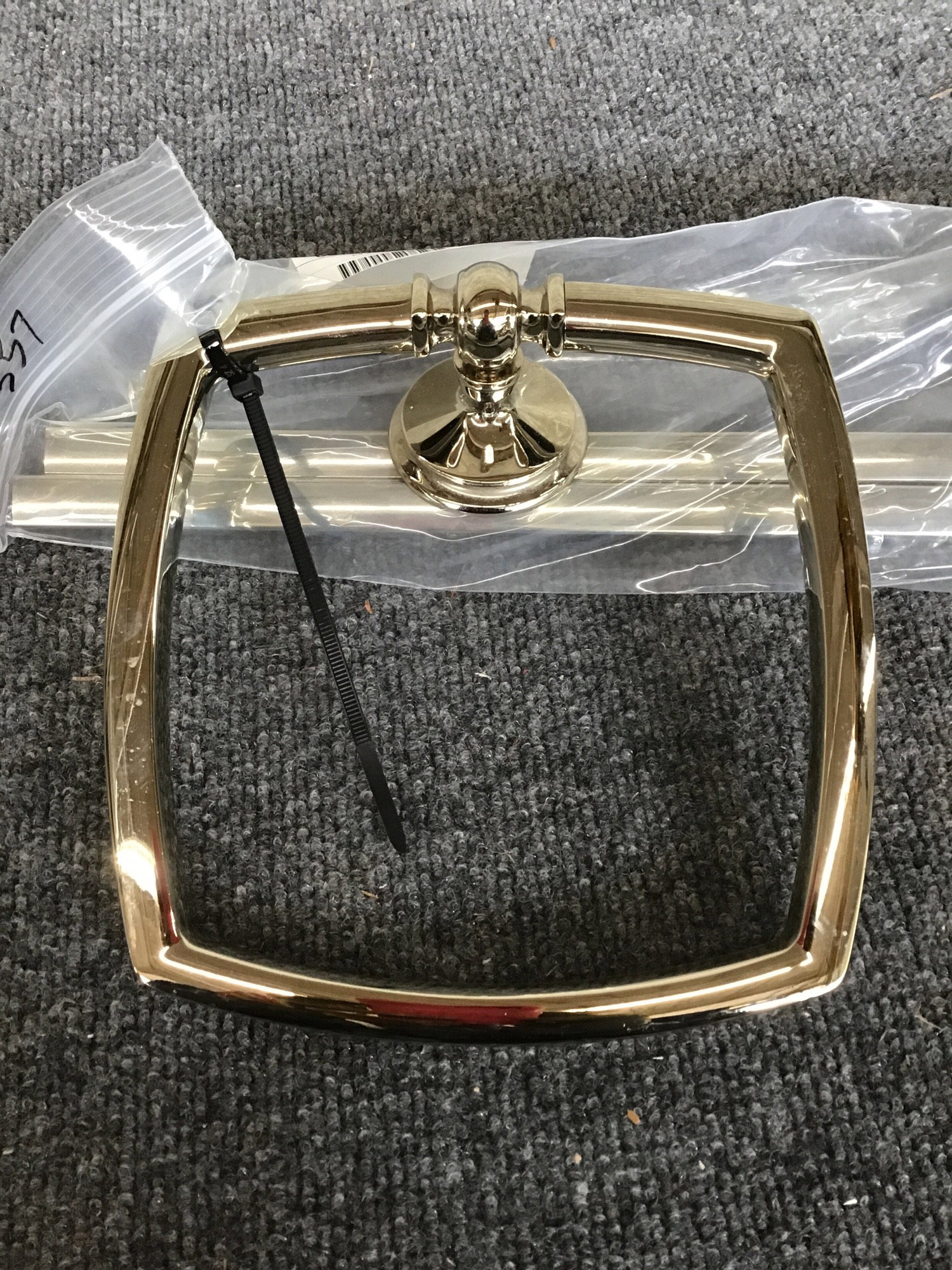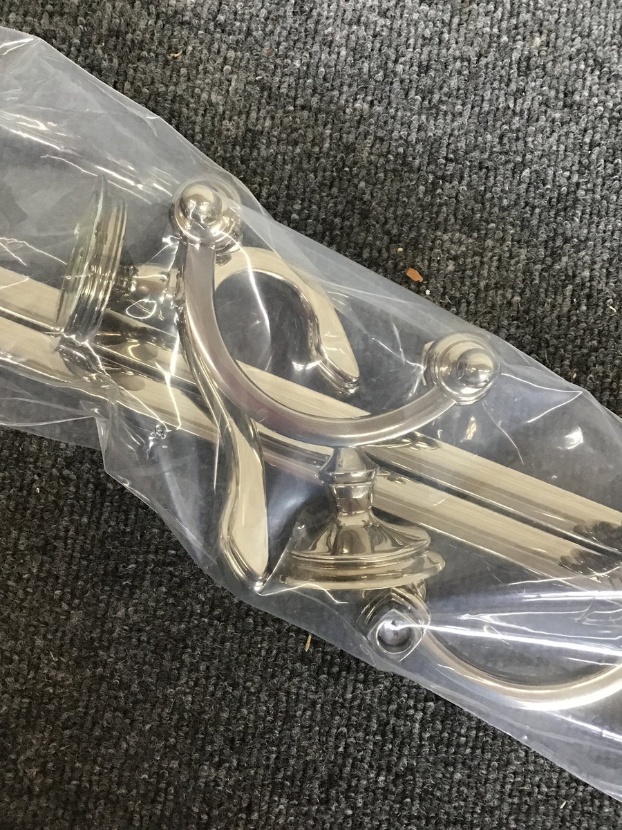 A kit of bathroom hardware with chrome finishes and a bit of heft to each piece. Contains a towel ring, a towel bar (with two bars), and a robe hook. Dimensions listed refer to the size of the towel bar.