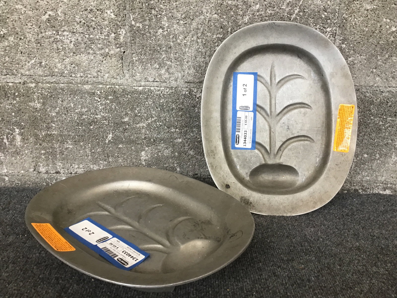 A pair of vintage serving platters made out of pewter- old pewter, by the looks of it, so they're SOLD AS DECOR due to potential lead content.
