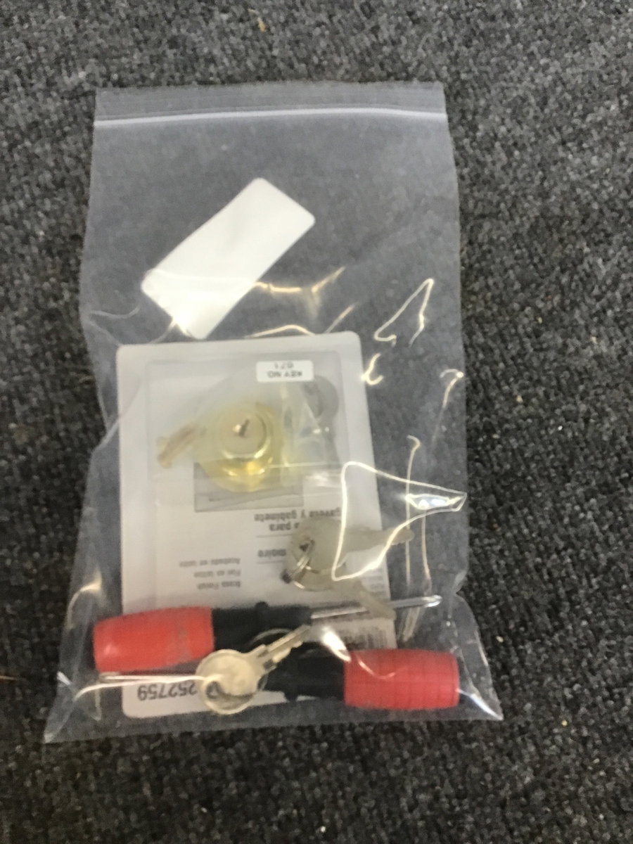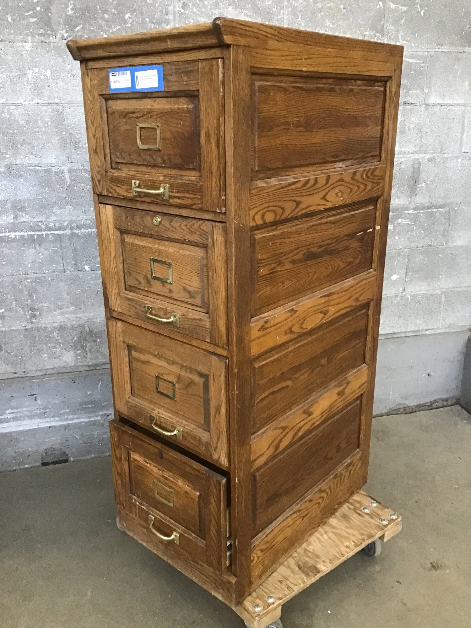 A beastly and beautiful vintage file cabinet that looks to sport oak construction with brassy pulls and a lock for one of the drawers. There's an included (but not installed) lock for a lower drawer that has had its lock removed previously.