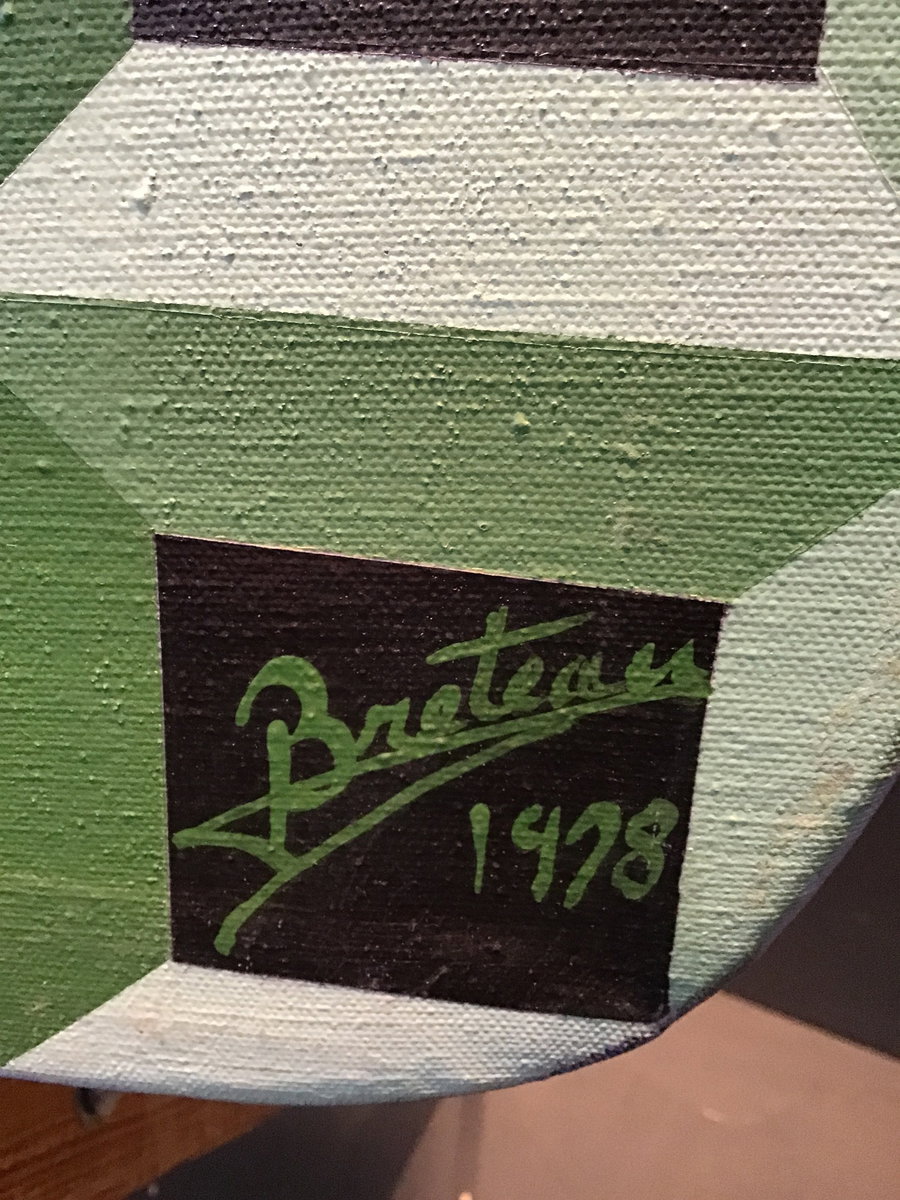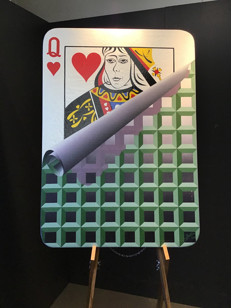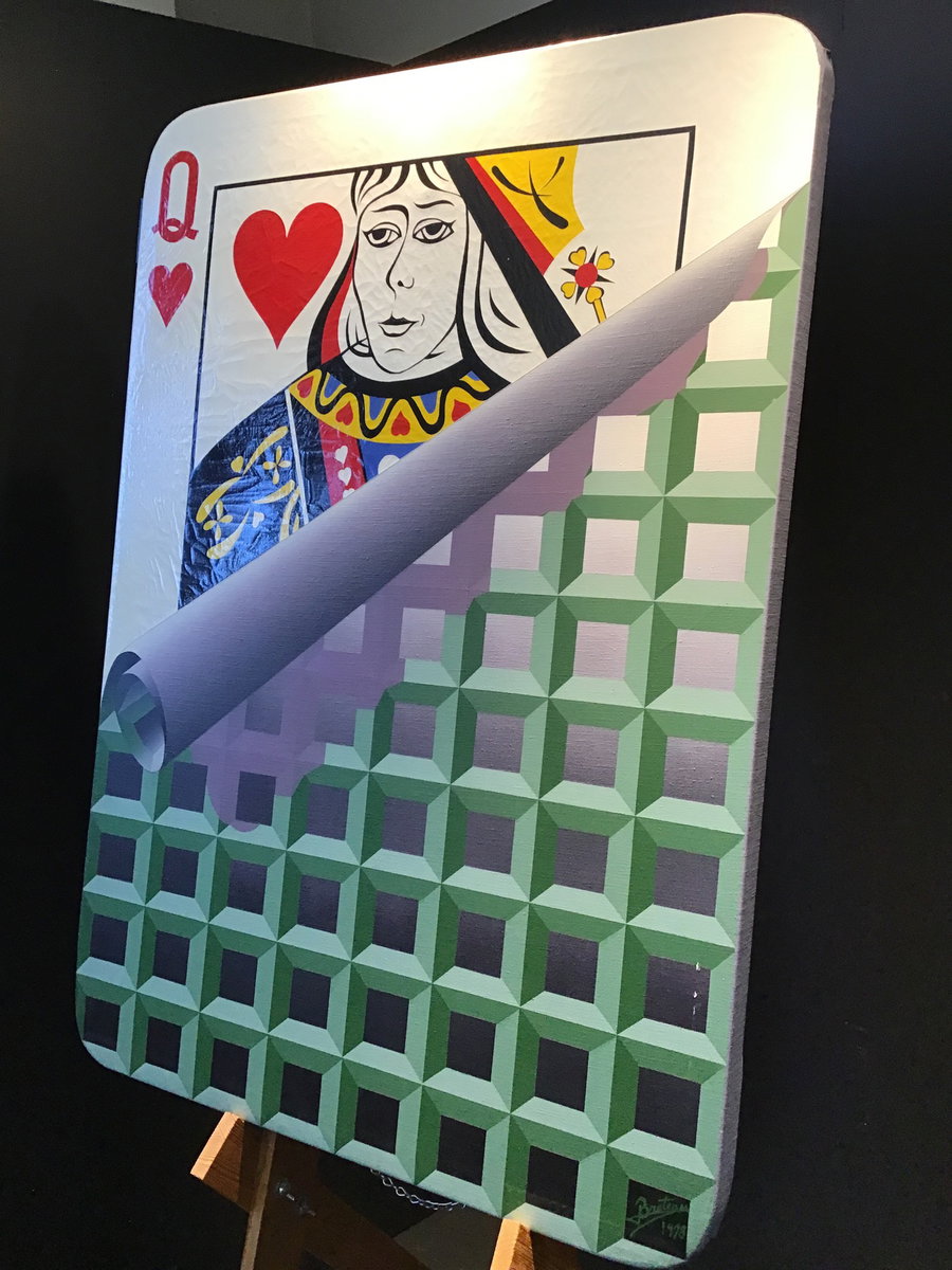 This is really something special an original painting on canvas of the Queen of Hearts by renowned French artist Patrice Breteau who specialized in abstract and futuristic surrealism with an emphasis on perspective. Breteau was even chosen, along with Salvador Dali, to paint original posters for the 1980 Olympics! This original is of the Queen of Hearts simply serving face as she is being unveiled behind a wall of 3D geometric squares. Surrealist art and 100% original which is of course always something special. Painted on canvas with a couple miniscule dings. Signed on bottom right corner and dated 1978. Breteau originals range anywhere from $500-$20,000 on the auction market!