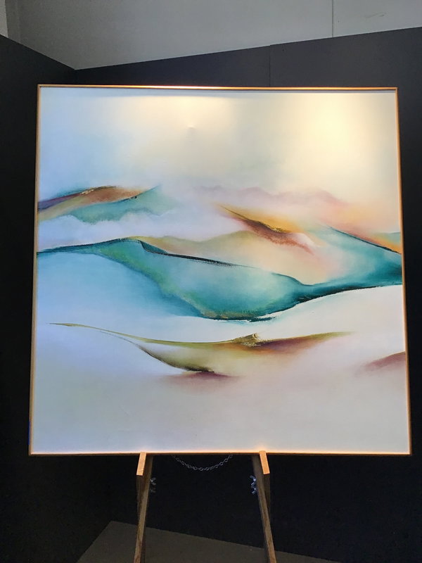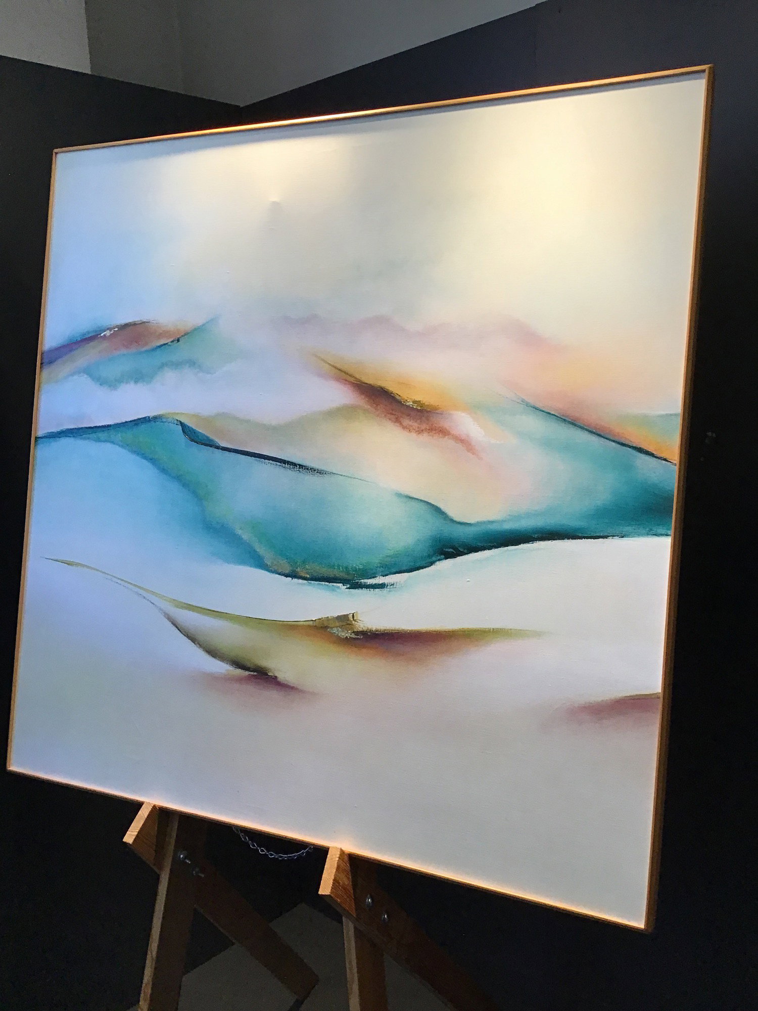Large and lovely abstract original painting on canvas. Sweeping strokes of pink, gold, blue, and green that almost look like mountains. Well framed in solid wood and tag on back says this piece is by an artist named Vick Hall.