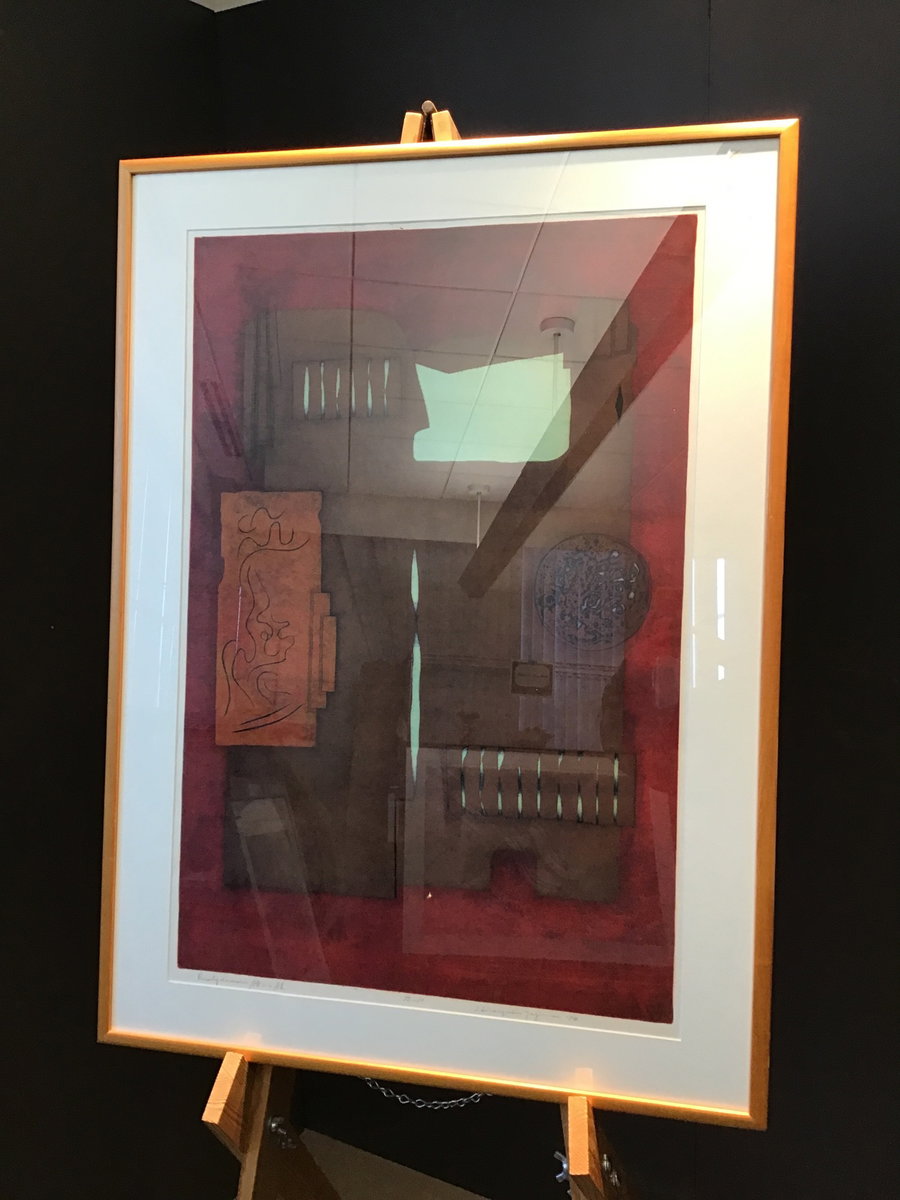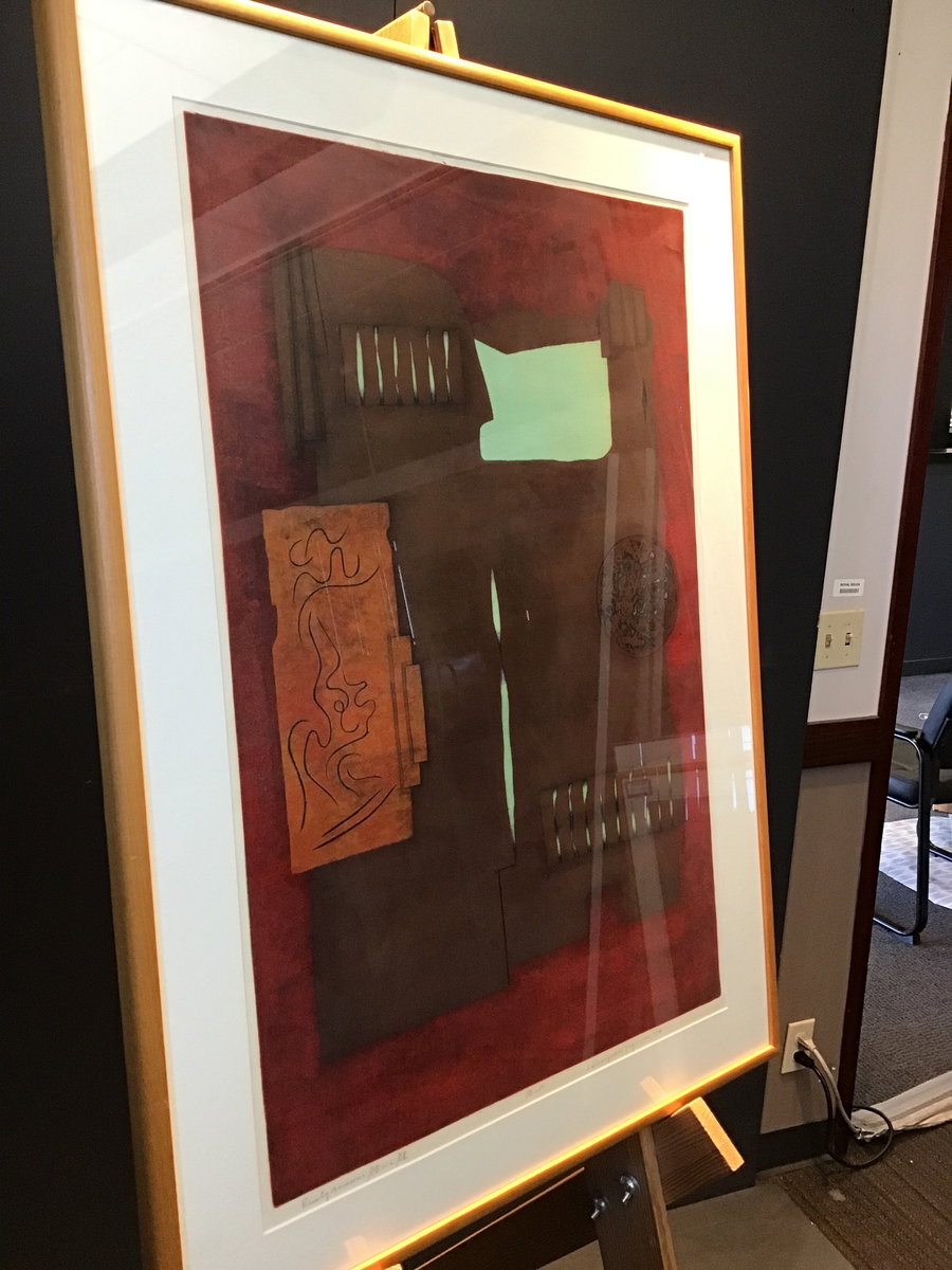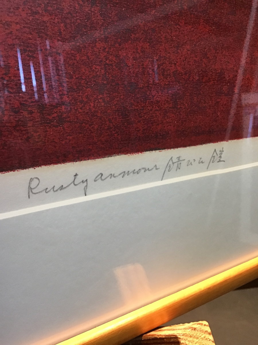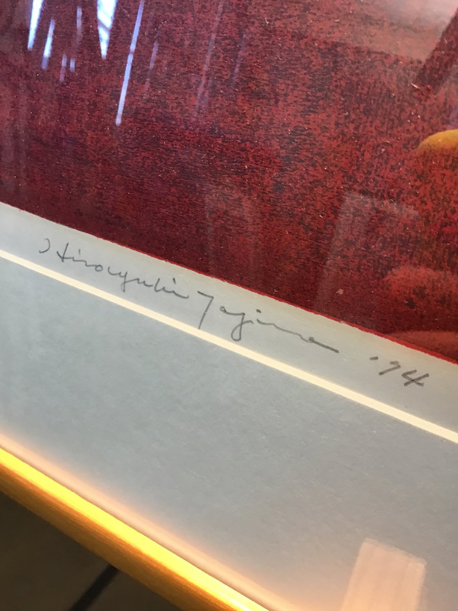 Tajima Hiroyuki was a prominent Japanese contemporary artist who specialized surrealism and abstract oil paintings before transitioning to woodblock printing in the middle of the century. Here we have a woodblock print of his work "Rusty Armour" from 1974. Brilliant use of color and shapes bring this abstract piece to life. Signed in pencil on the bottom of the piece with title of work and artist signature.