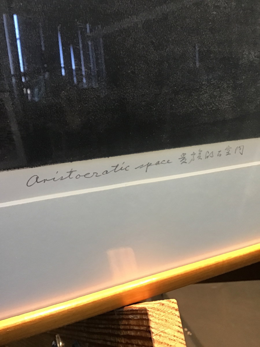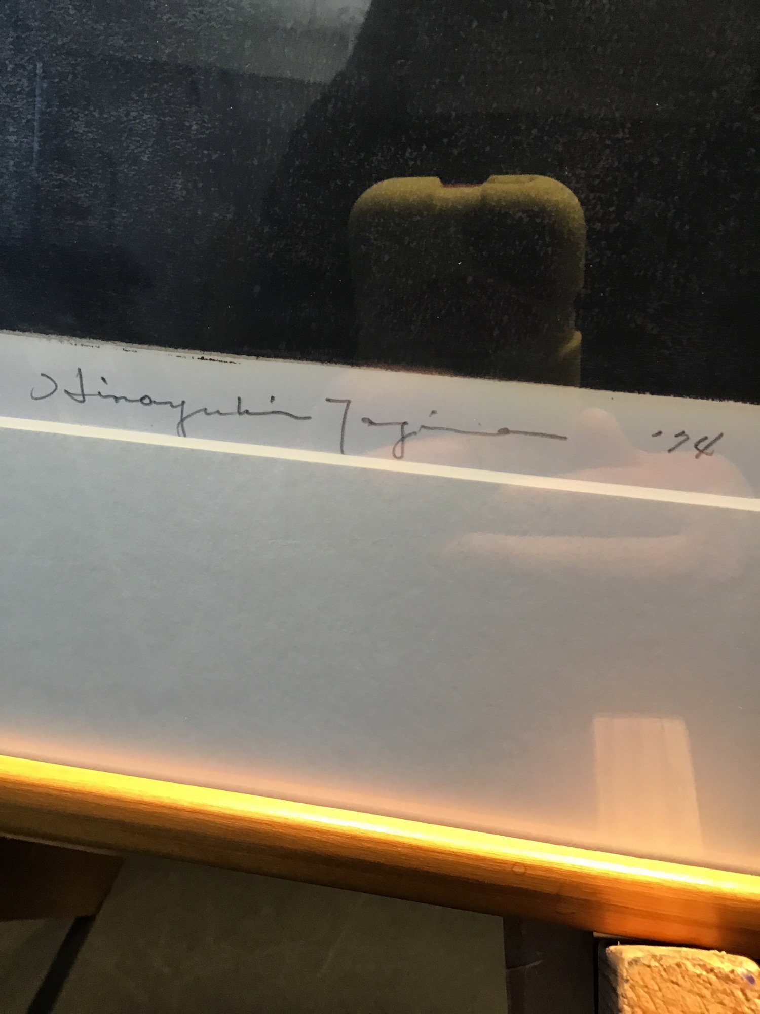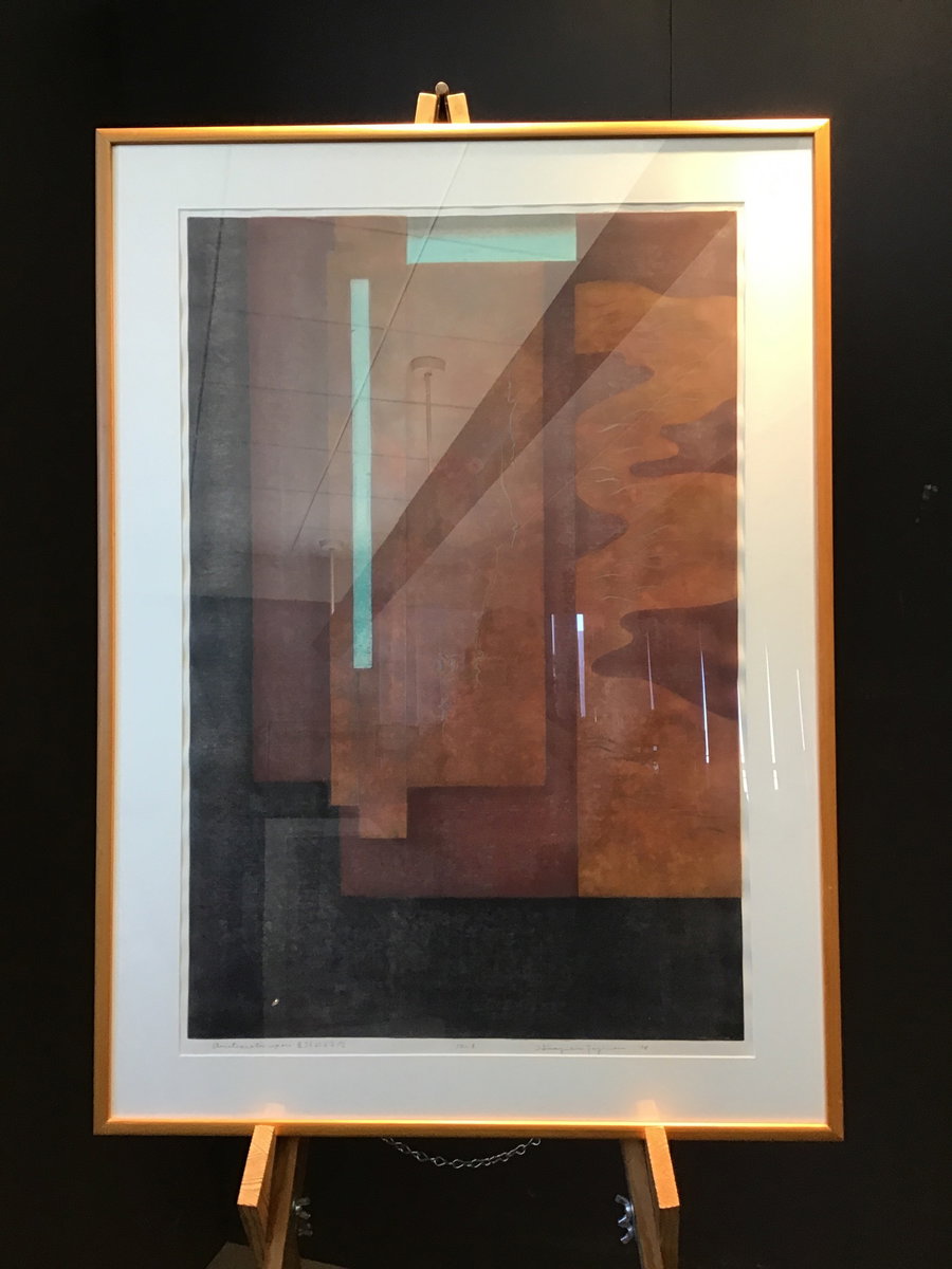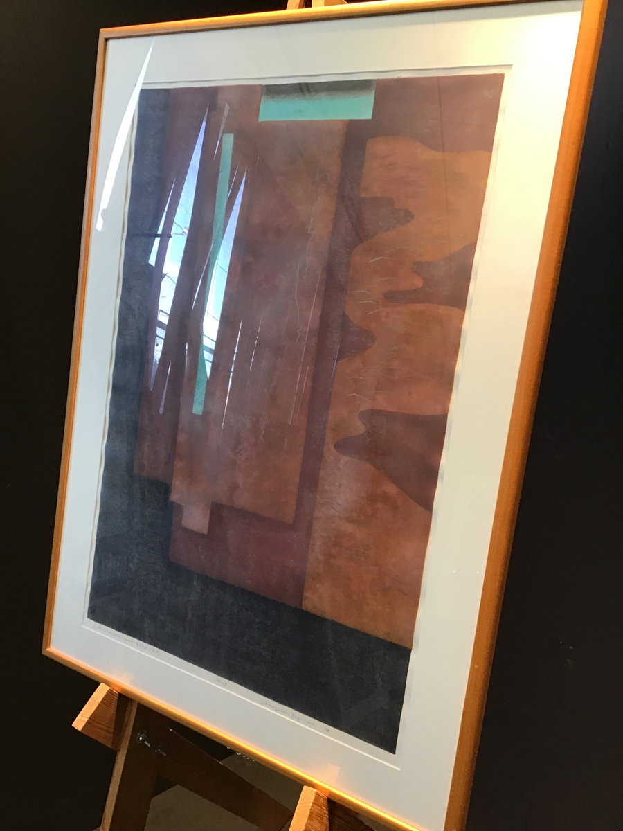 Tajima Hiroyuki was a prominent Japanese contemporary artist who specialized surrealism and abstract oil paintings before transitioning to woodblock printing in the middle of the century. Here we have a woodblock print of his work "Aristocratic Space" from 1974. Brilliant use of color and shapes bring this abstract piece to life. Signed in pencil on the bottom of the piece with title of work and artist signature.