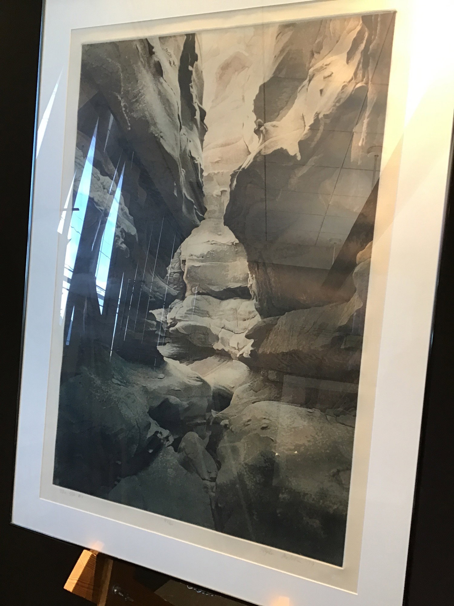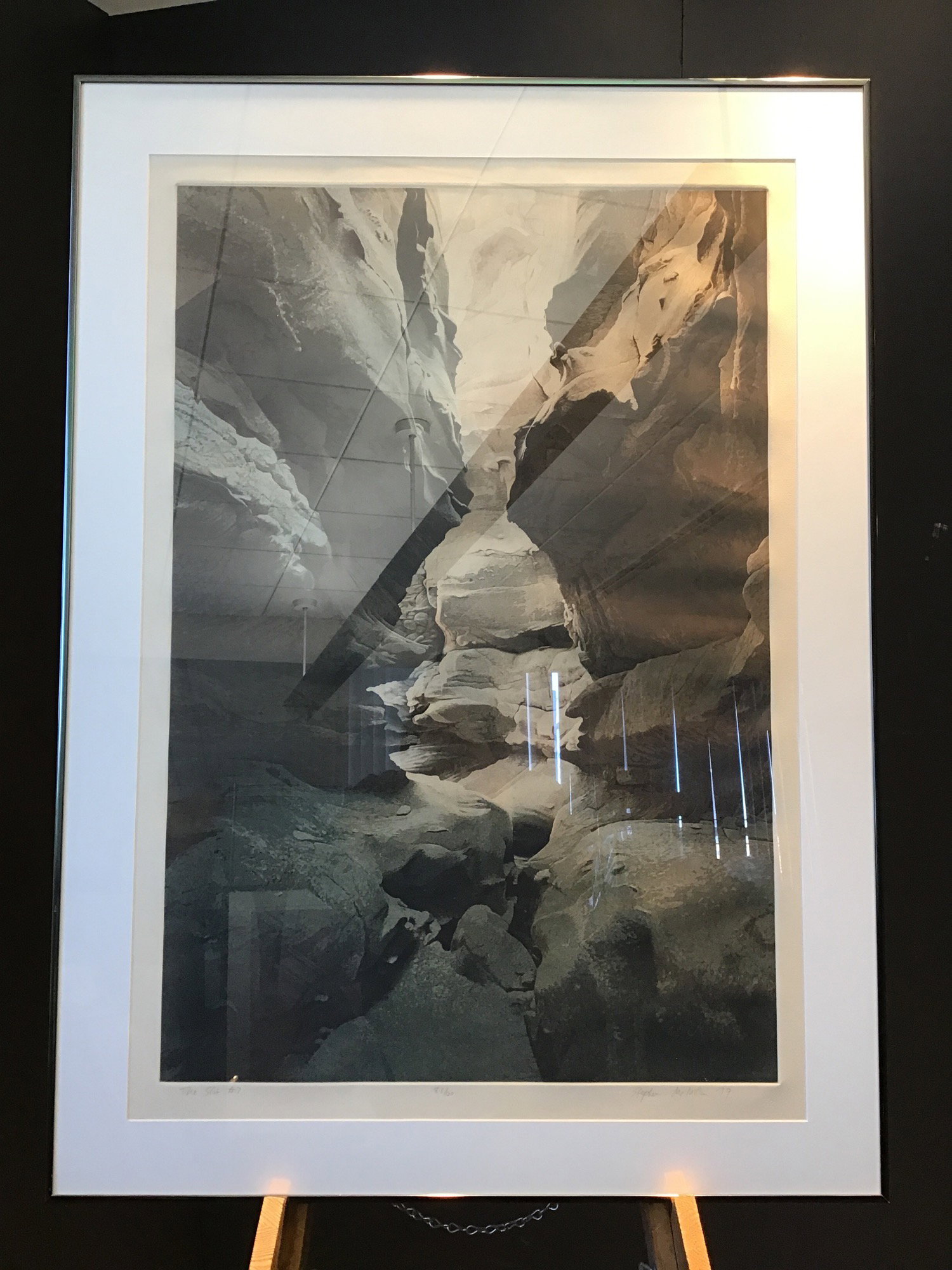 Aquatint etching on paper titled "The Slot #7" by contemporary artist Stephen McMillian. Aquatint is a popular printmaking method involving pressing grooves into the printing plate. This work shows a narrow canyon opening and is beautifully framed. This particular work is even on display at the Brooklyn Art Museum! Signed and numbered 83/120 in pencil on the bottom.