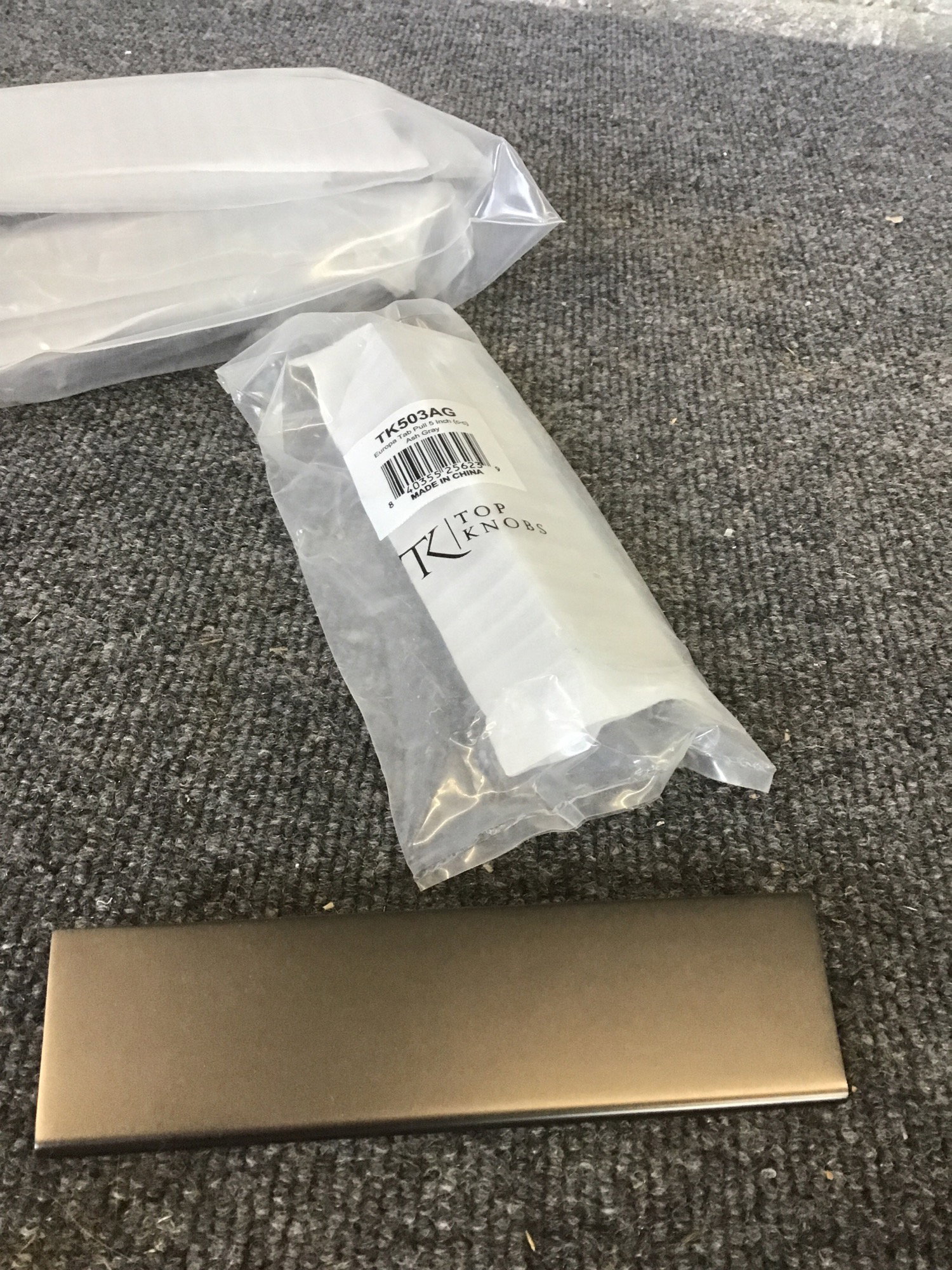 12 "Europa" finger pulls from Top Knobs in ash gray. Enough for a bathroom or small-medium kitchen! These retail for $18 each at Fergeez.