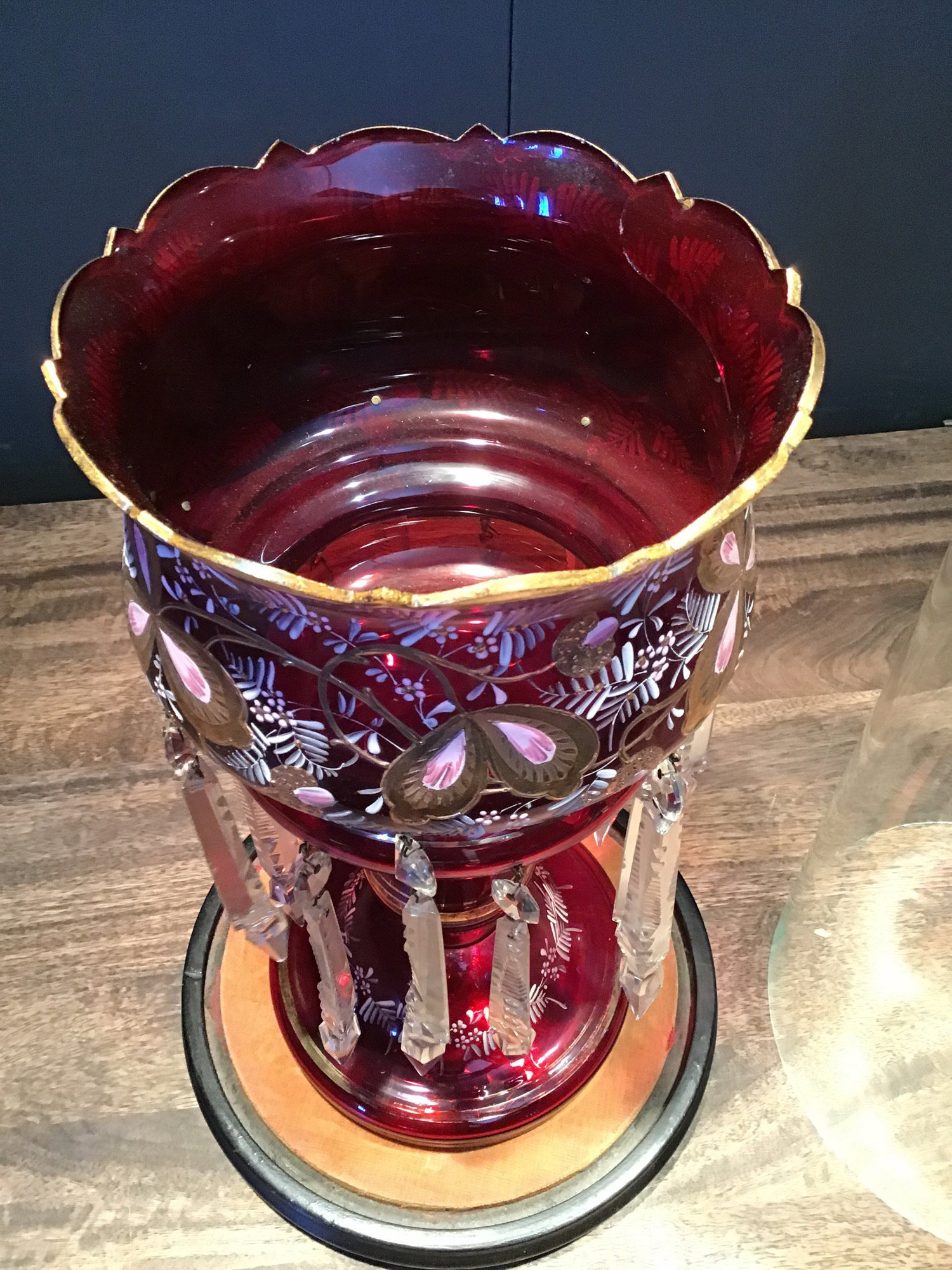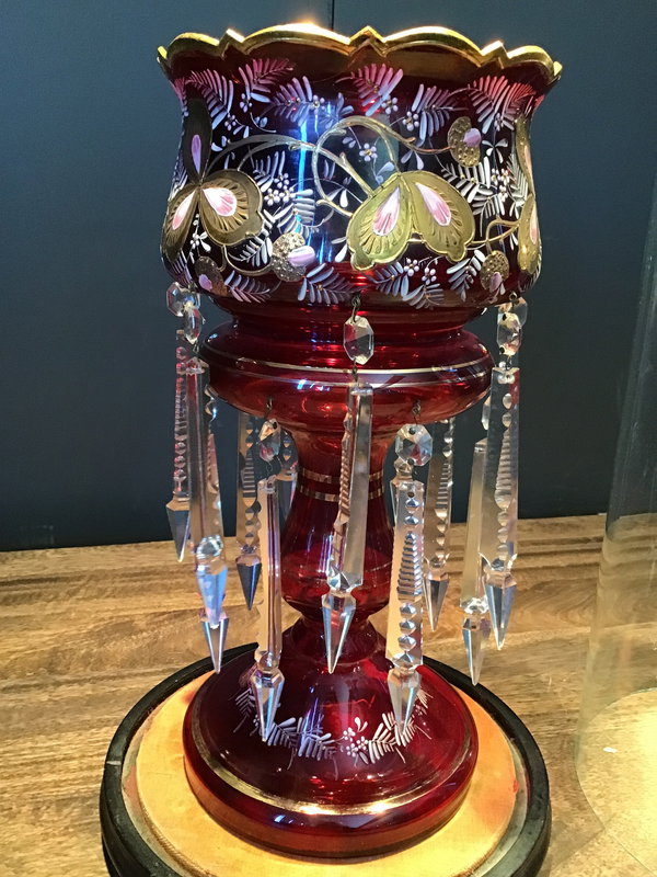 Gorgeous and sparkly antique mantle luster. Mantle lusters are decorative large candle holders typically placed on a mantle. This amazing piece comes adorned with dangly shiny prisms and hand painted gold and pink floral designs. Cranberry colored Bohemian glass and painted gold trim. Also comes with a perfectly sized pedestal and cloche to really display its beauty!
