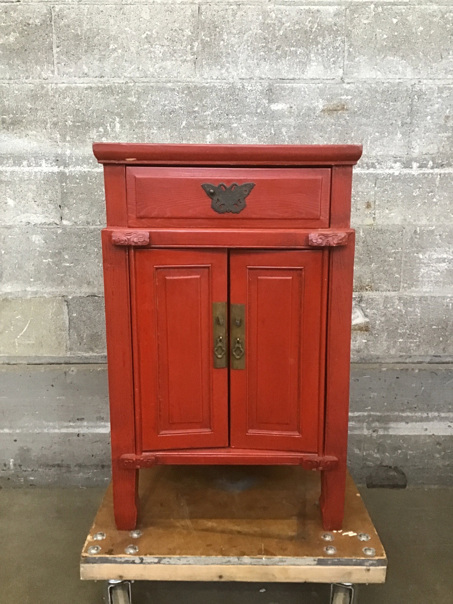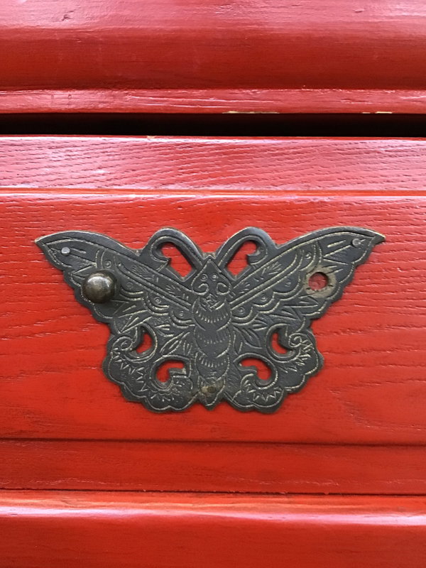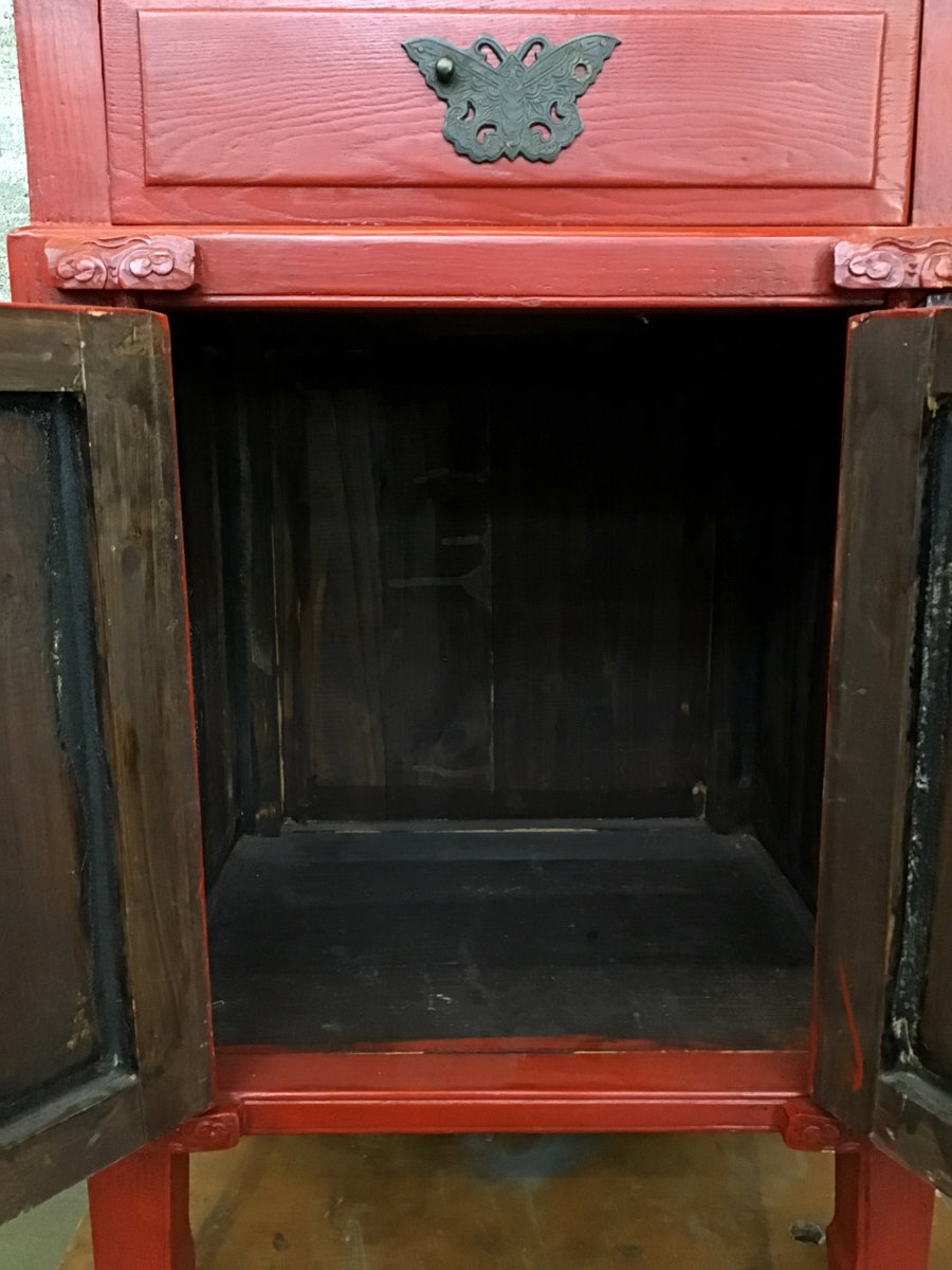 This is a charming little Chinese wedding style freestanding cabinet that stands on 4 legs. Has two small panelled cabinet doors that lead to a small storage space and a small drawer above that. Unsure of the species of wood this is made from because of the bright red paint job. The hardware is an ornate aged brass. The drawer is missing it's pull but the butterfly is worth saving. The top has a split in the wood.
