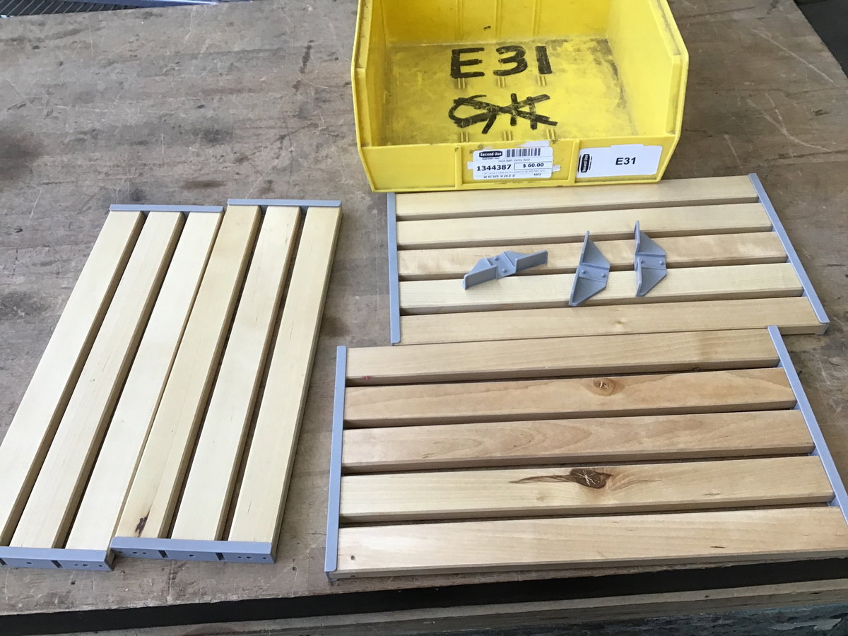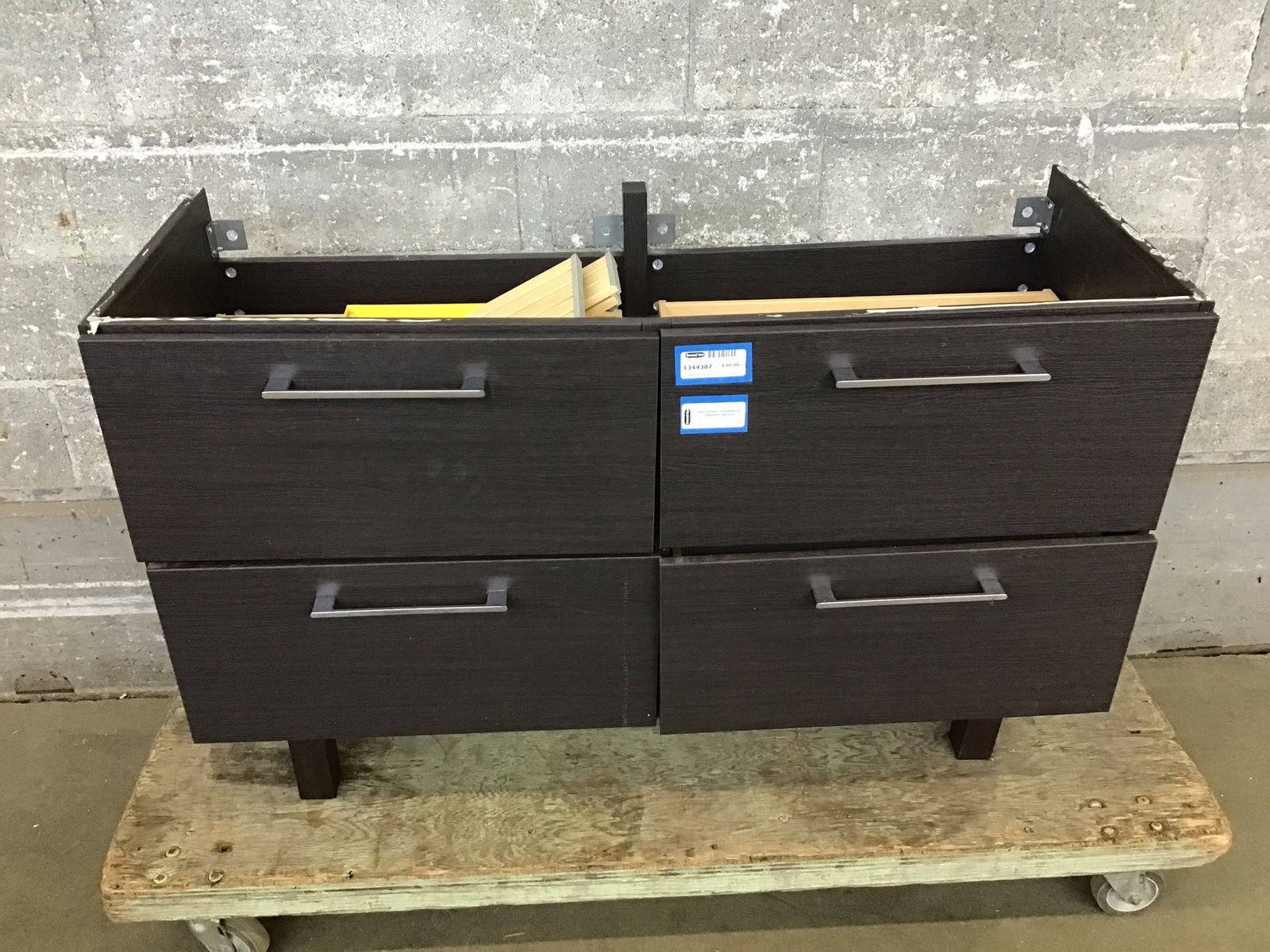 I can't prove it 100% but this appears to be IKEA bath vanity base. Has a very dark stained laminate oak finish, four drawers with polished nickel pulls, and comes with 4 slat dividers for the drawers. The vanity sags a little in the middle if it is not secured and shored up to a wall.