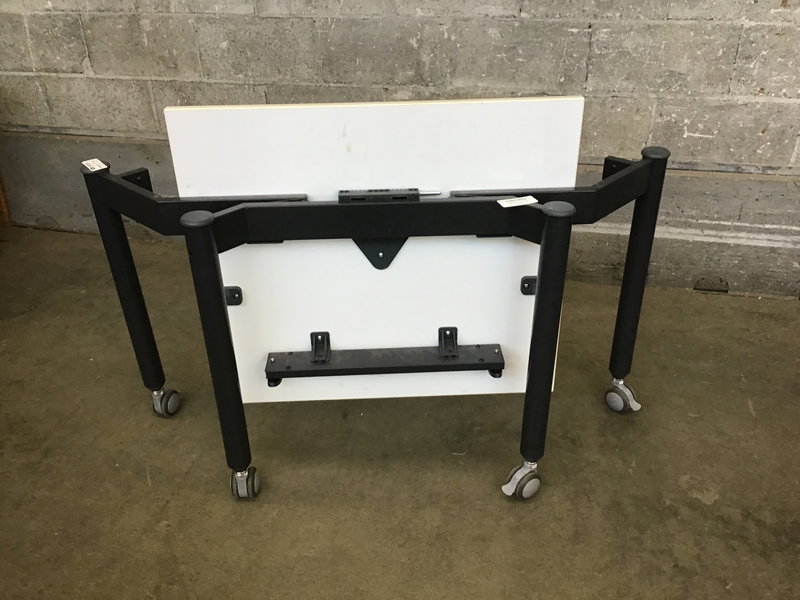 Unique folding work desk, previously from a school. This desk can tuck away easily when the two front legs are pushed to the side, allowing the laminate tabletop to fold down. This unit could easily be rolled into a closet when not in use. Photo is representational.