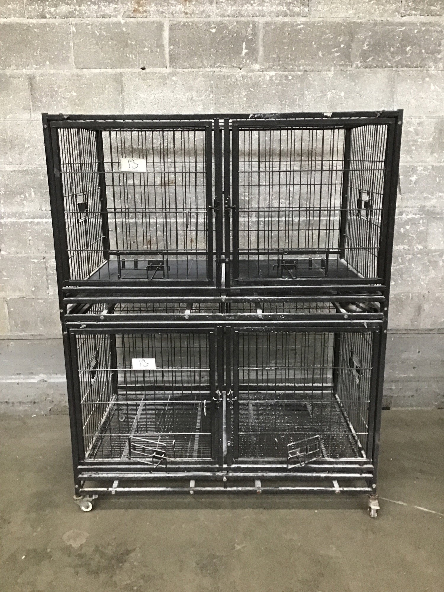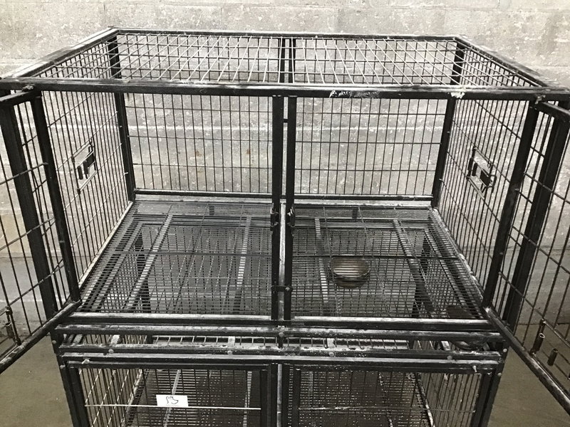 A double stacked Homey Pet 'Shark Cage' each with fastenable doors and a set of casters. This is definitely not a small scary space to place a little buddy; no sir! This here is for pets with an affinity for water and a talent for scuba diving! These cages were almost used in the film 'Jaws' as the director initially wanted the cast to be entirely dogs. This was shot down unfortunately, but these Homey Pet 'Shark Cages' will make your pet safe while doing scuba. (This was a flight of fancy, do not let a dog scuba, they don't have thumbs.) Photo may be representational.