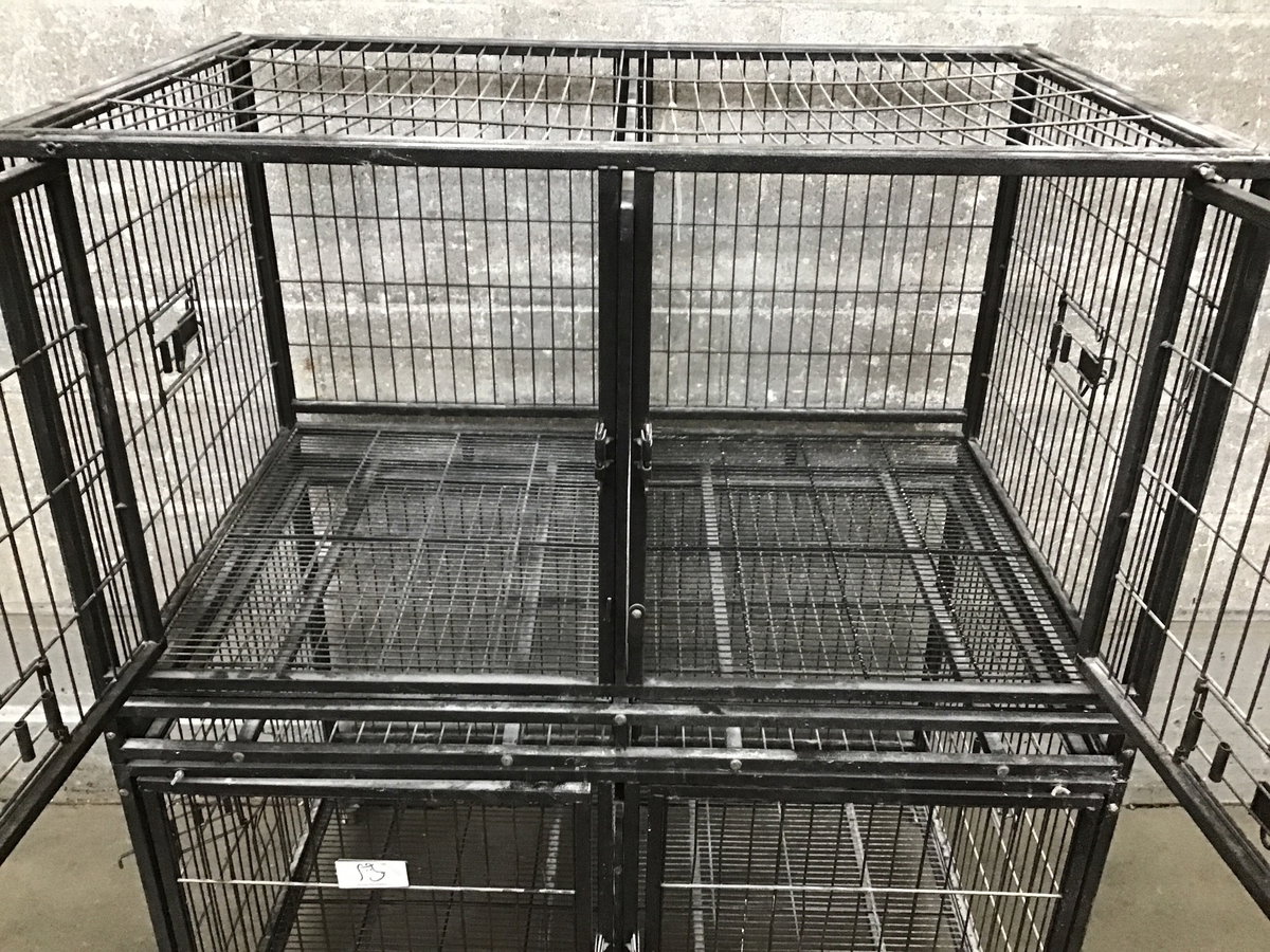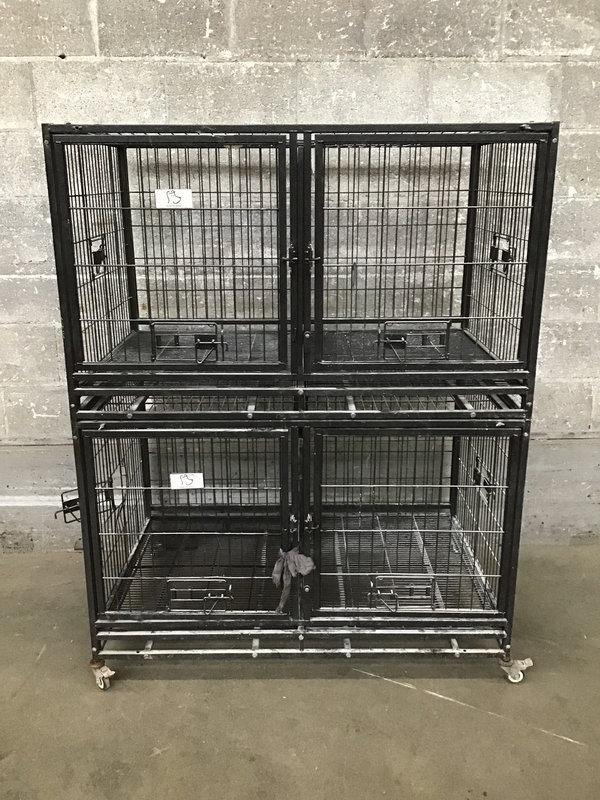 A double stacked Homey Pet 'Shark Cage' each with fastenable doors and a set of casters. This is definitely not a small scary space to place a little buddy; no sir! This here is for pets with an affinity for water and a talent for scuba diving! These cages were almost used in the film 'Jaws' as the director initially wanted the cast to be entirely dogs. This was shot down unfortunately, but these Homey Pet 'Shark Cages' will make your pet safe while doing scuba. (This was a flight of fancy, do not let a dog scuba, they don't have thumbs.) Photo may be representational.