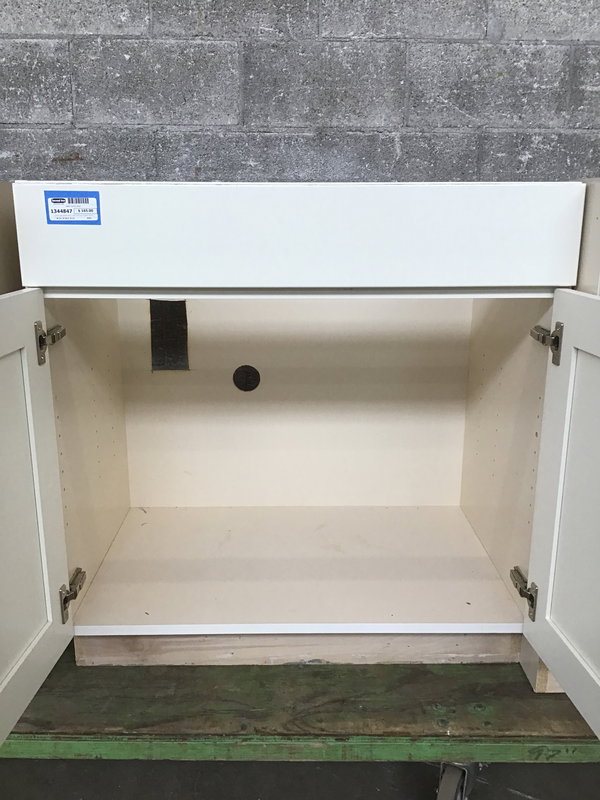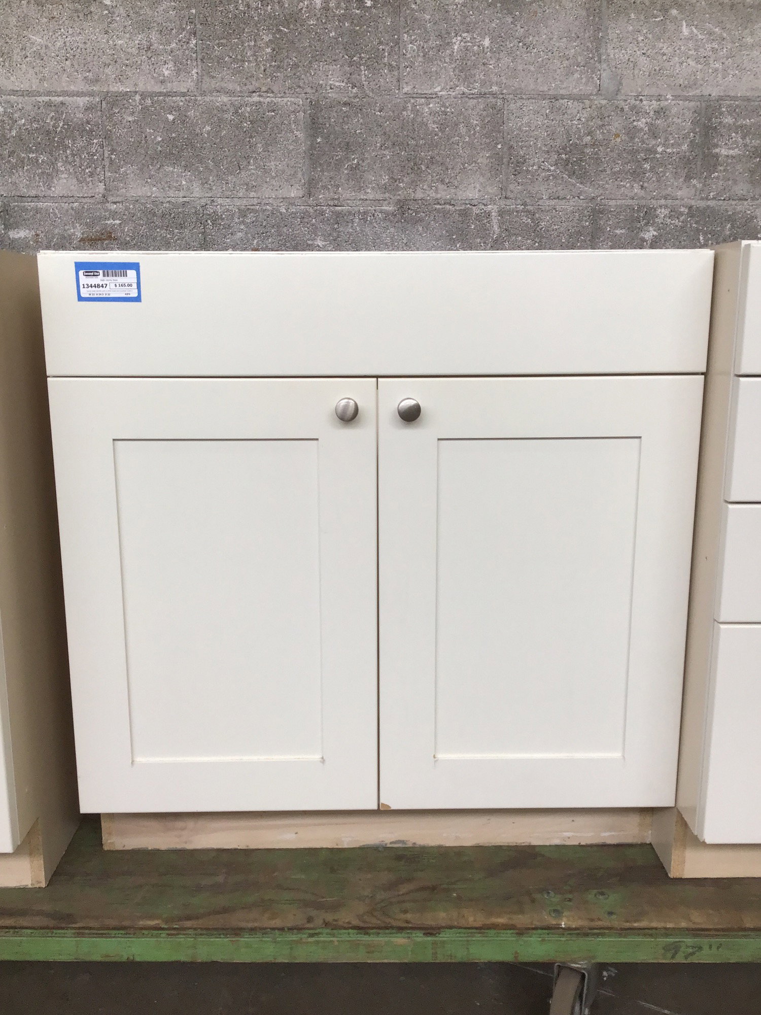 Vanity base cabinet with a white finish and brushed nickel knobs. Doors are painted solid maple with soft-close hardware.
