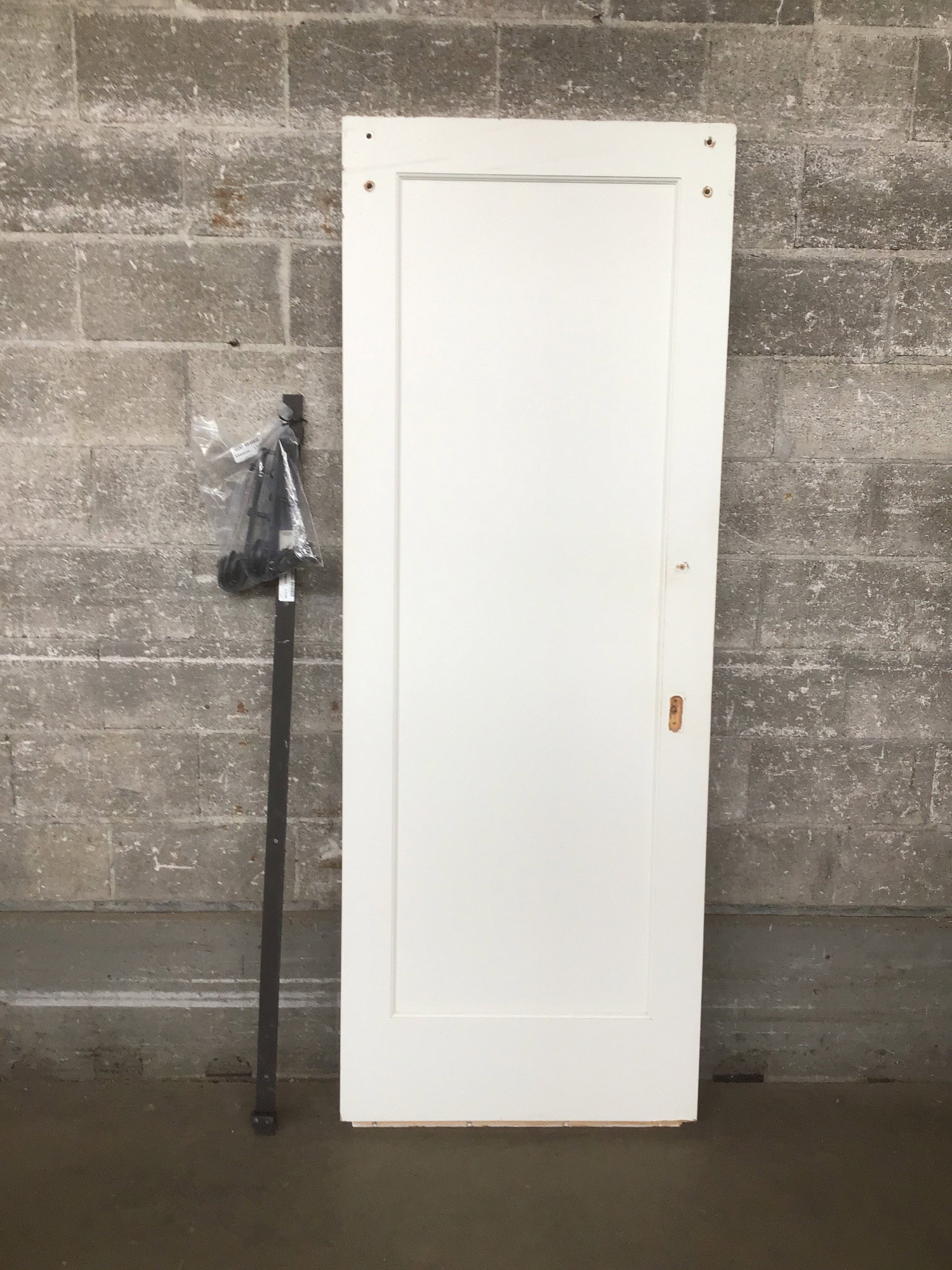 Single panel door with sliding barn door configuration. Includes hardware -- track, hangers, bumpers, inset handles.