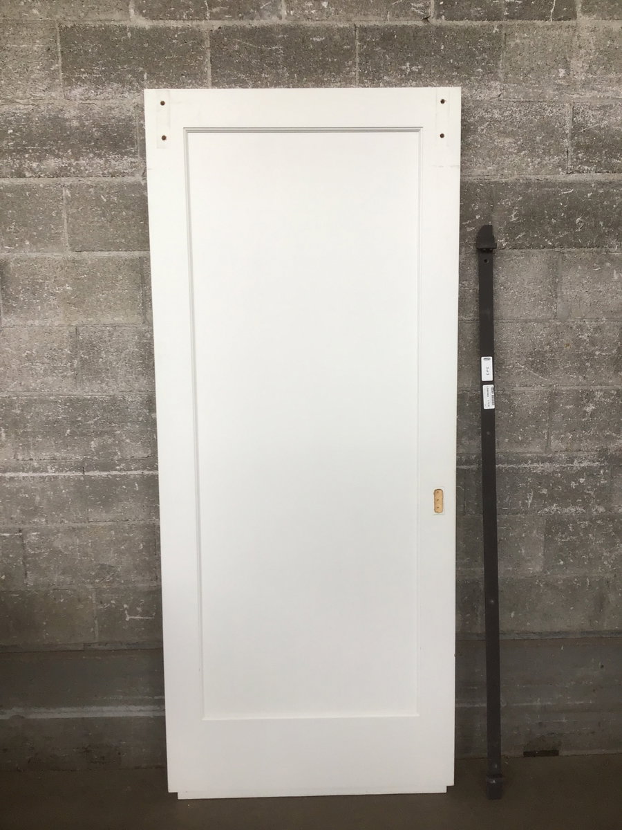 Single panel door with sliding barn door configuration. Includes hardware -- track, hangers, bumpers, inset handles.