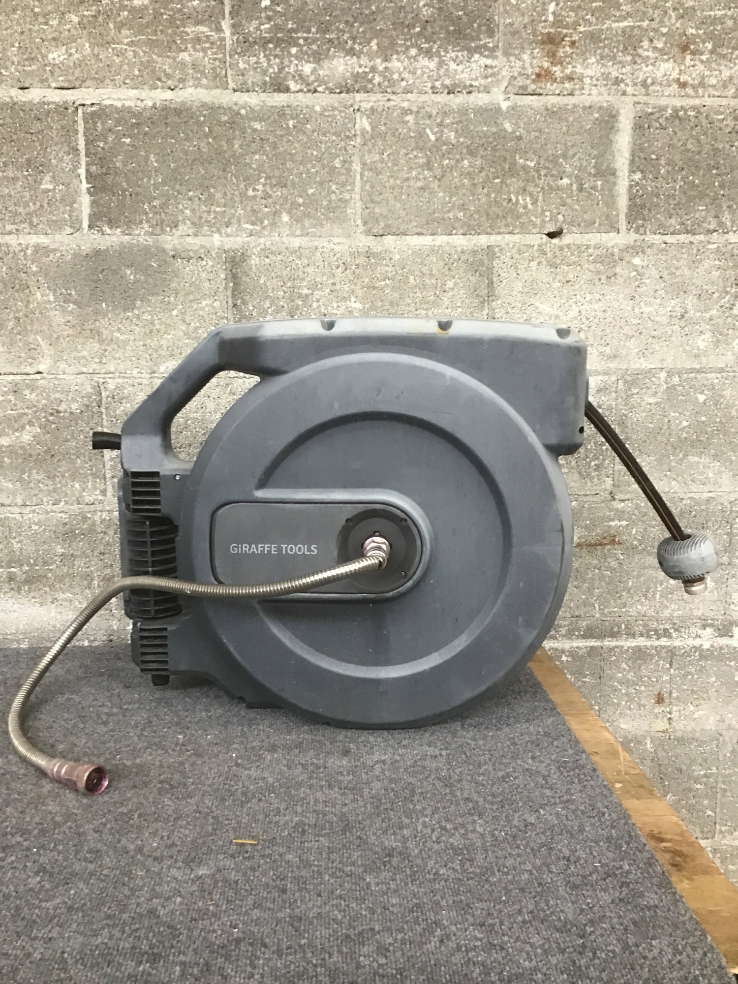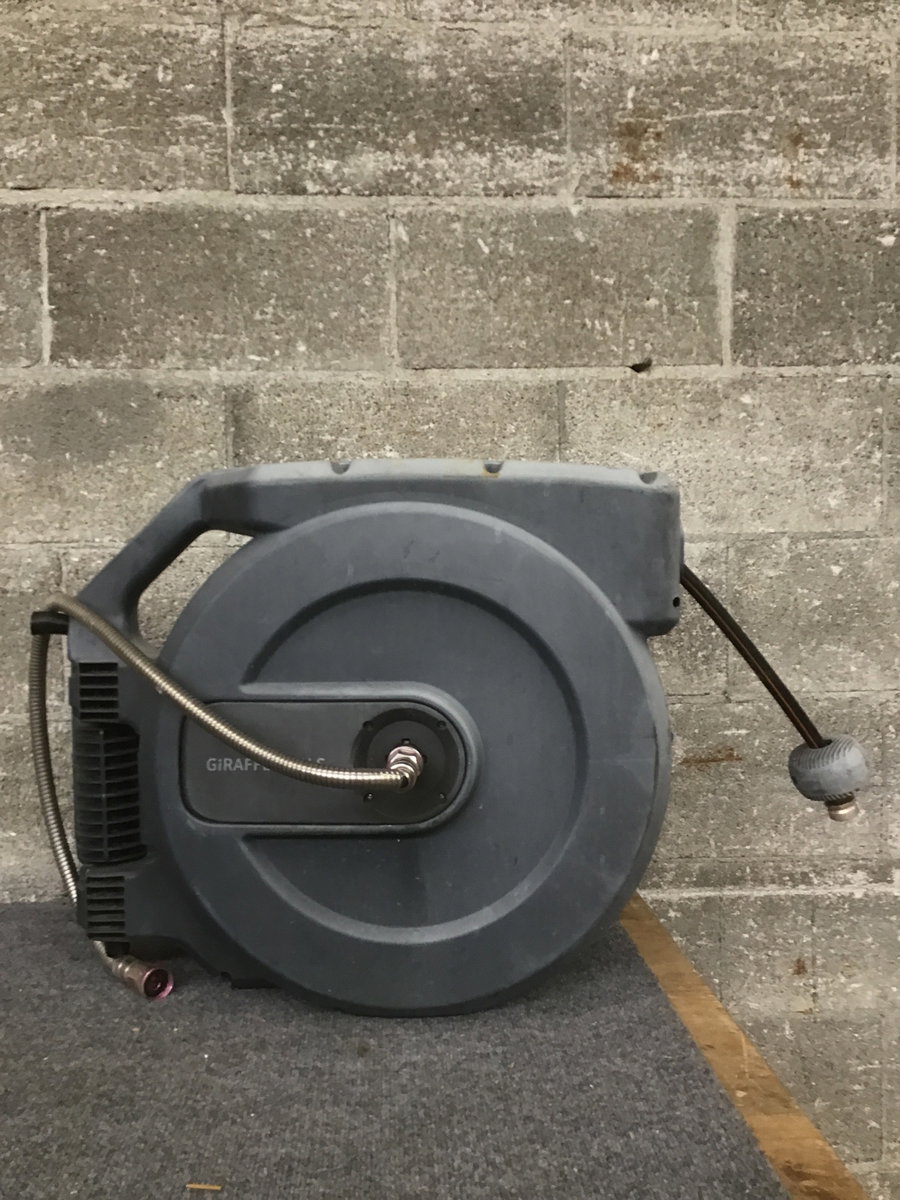 Wall mount retractable hose, appears to be in good used condition.