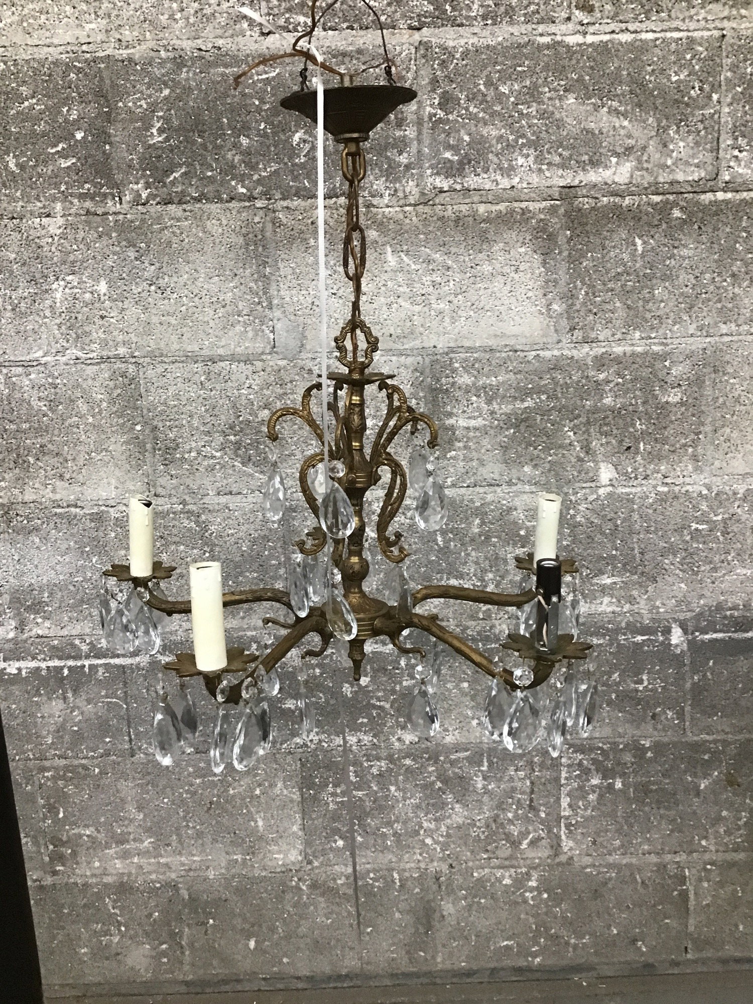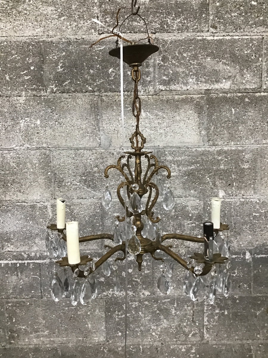 Spanish Revival-style 5-arm chandelier with a stamped brass body and faceted teardrop crystals. Is missing only three, and with some strategic placement no one has to know! Tested in-house and lit right up.