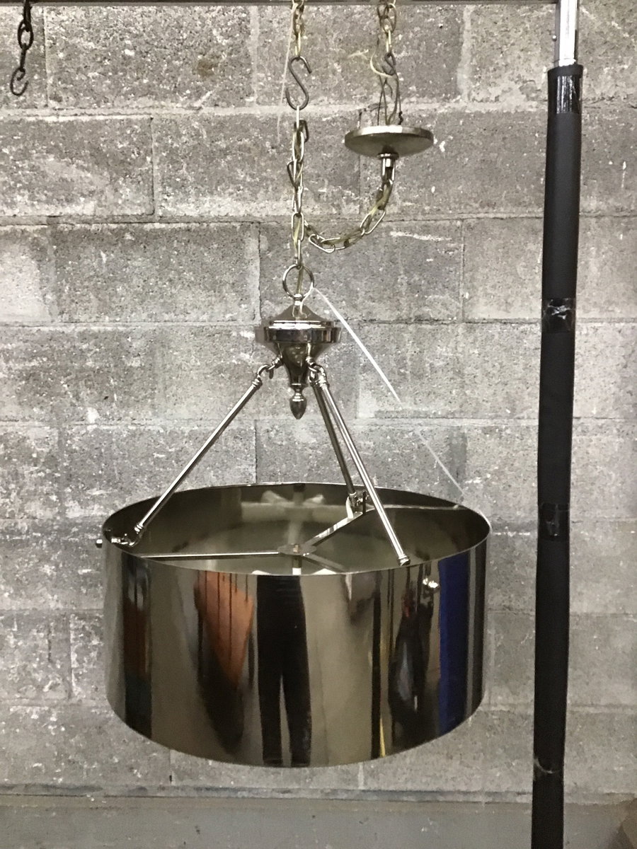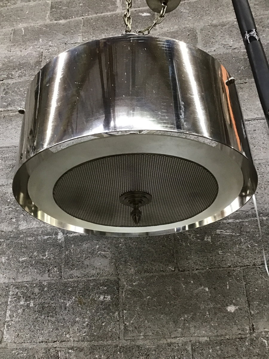 Fancy-looking chrome-ish drum shade suspended by three arms. Takes four bulbs, tested in-house and lit up just fine. Has a frosted glass section on the bottom covered by a perforated metal sheet.
