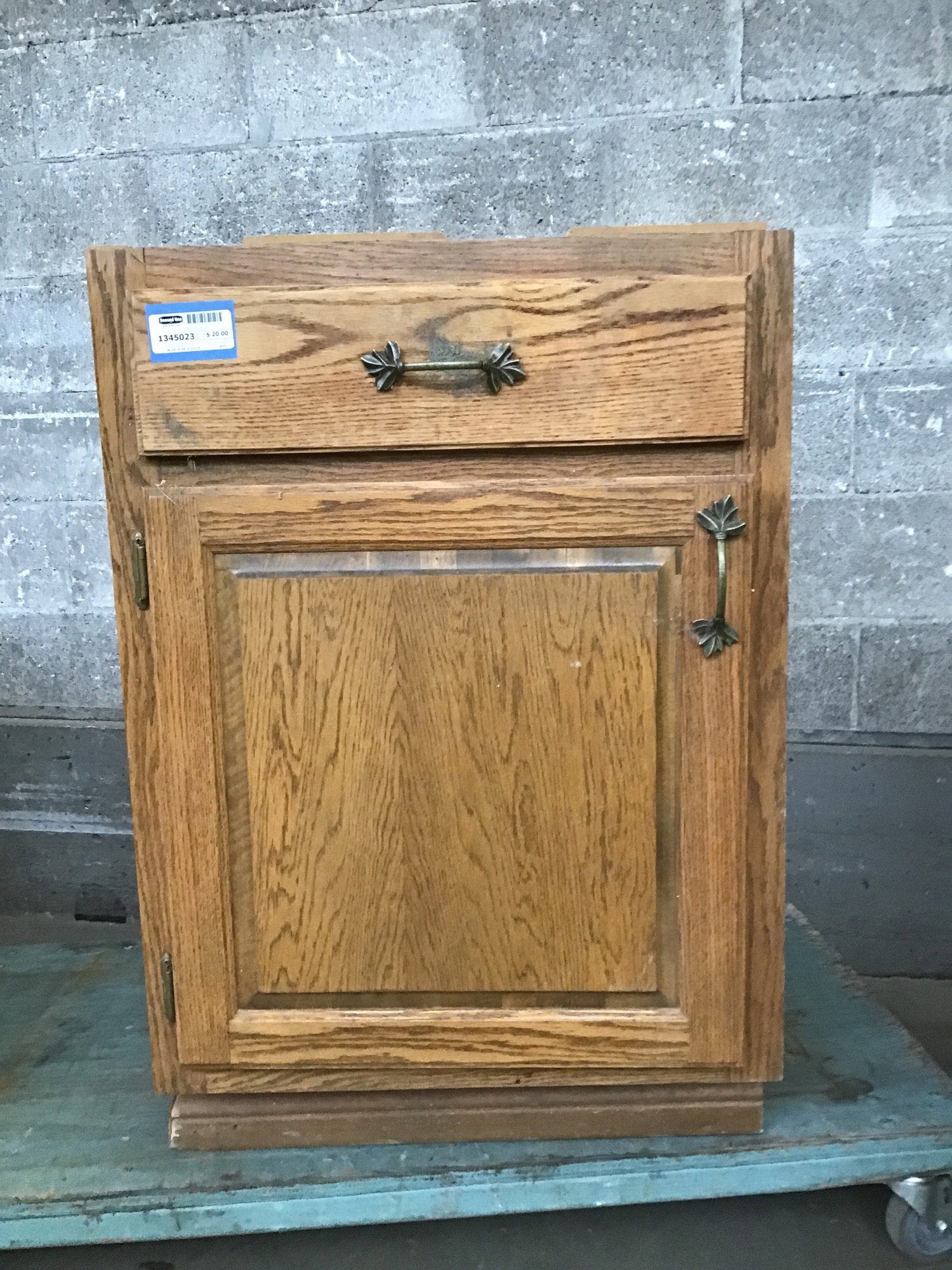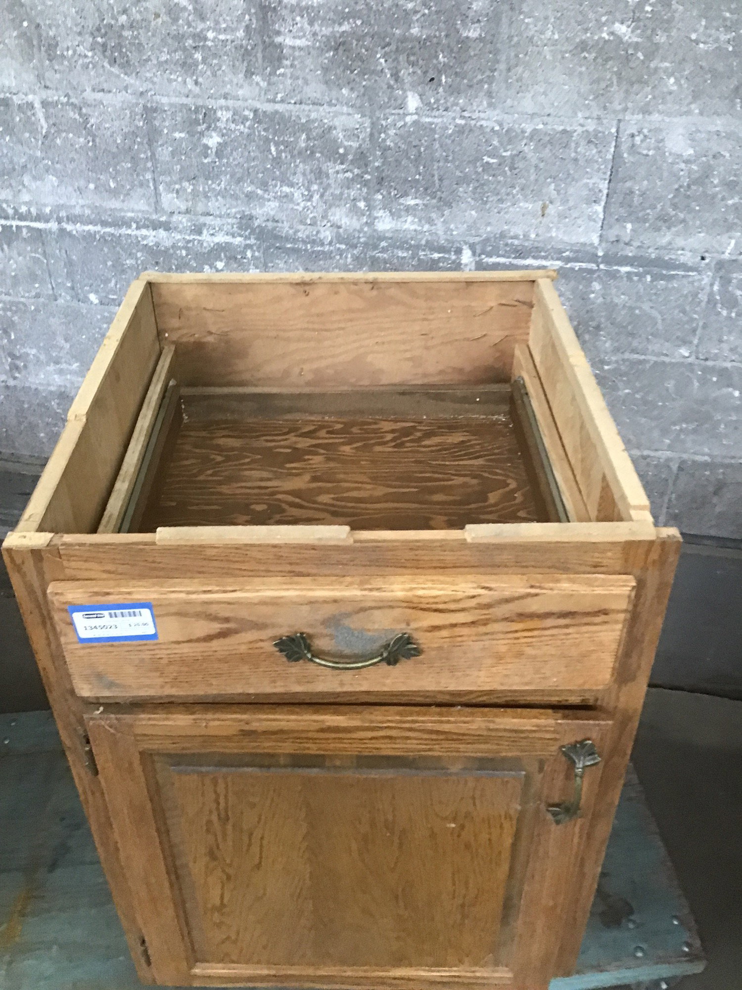 Older-style oak base cabinet with leafy hardware. Plywood box, solid drawer and face. Has some old contact paper inside that could use some redoing. Overall a little tired, would make a good shop cabinet these days.