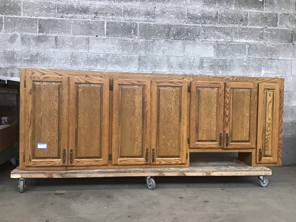 Longer bank of four upper cabinet boxes with oak faces and chunky vintage pulls. Overall a little tired, would make a good shop cabinet nowadays.