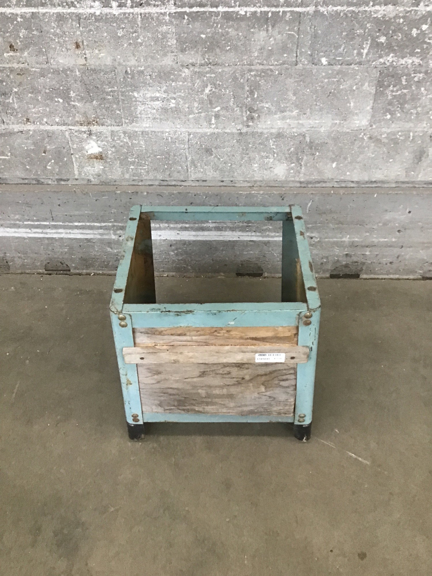 A very charming solid metal table saw stand by brand 'Delta'. This solo tool stand features a charming muted turquoise paint job and a black painted trim at the base.