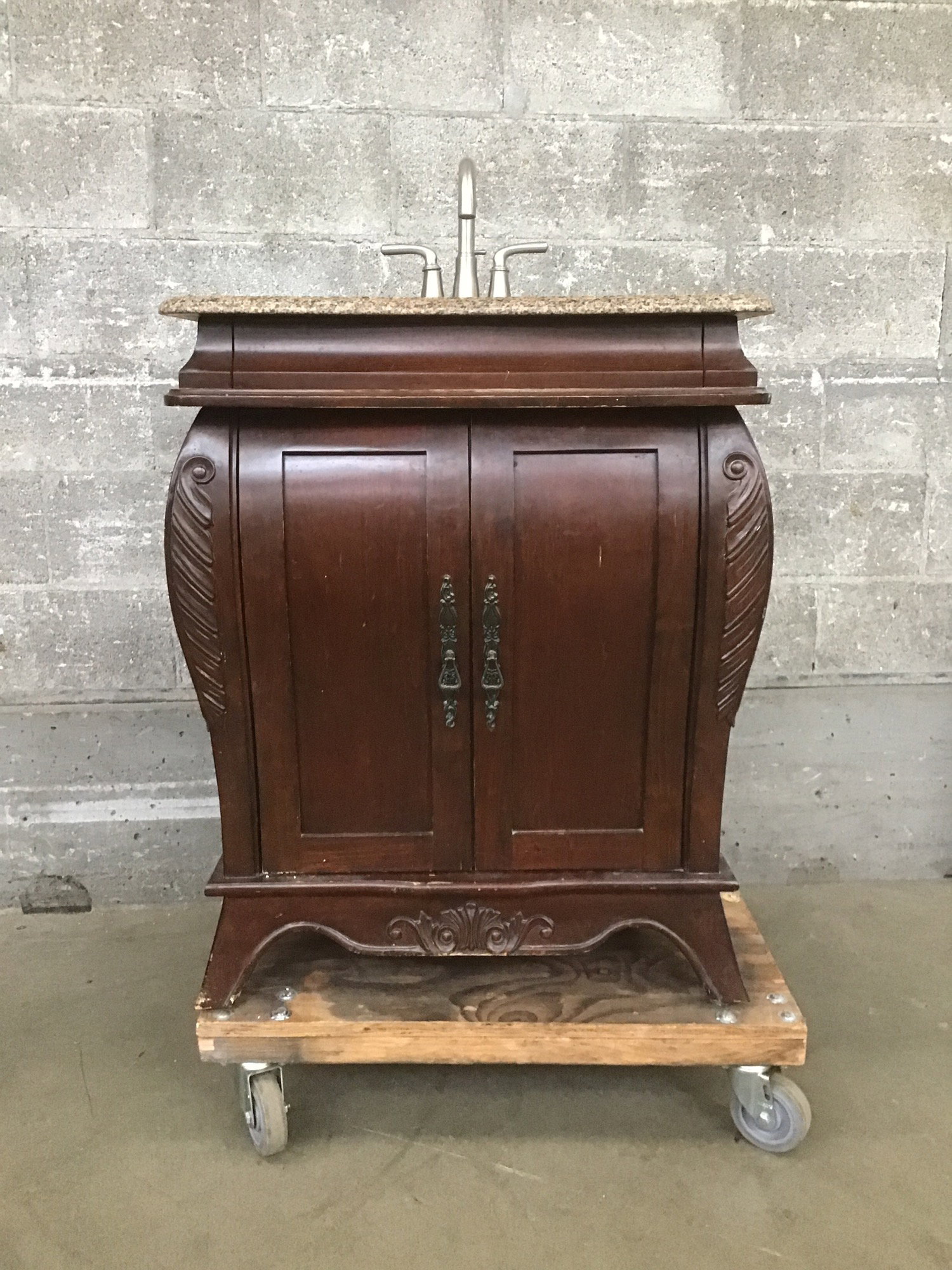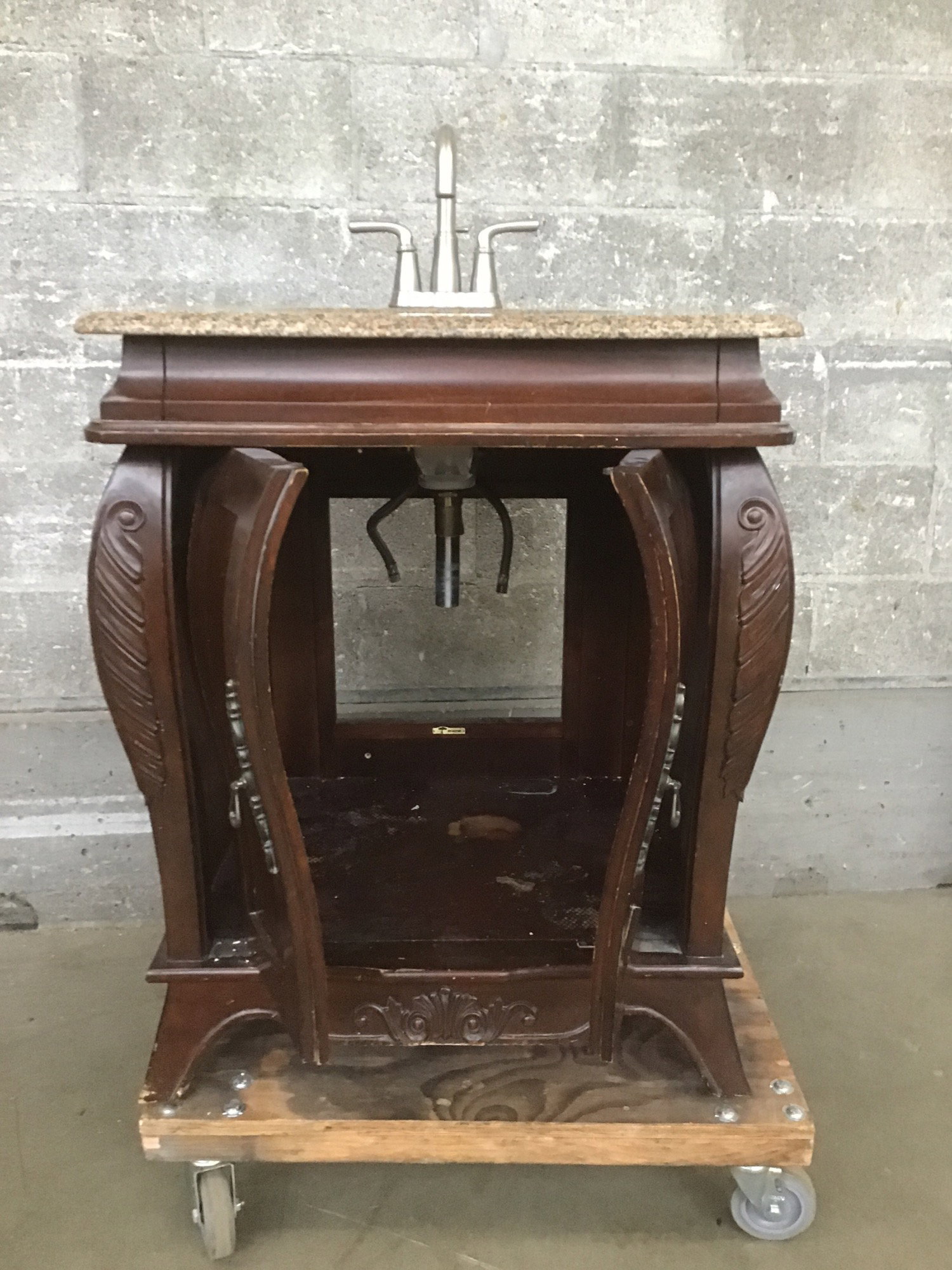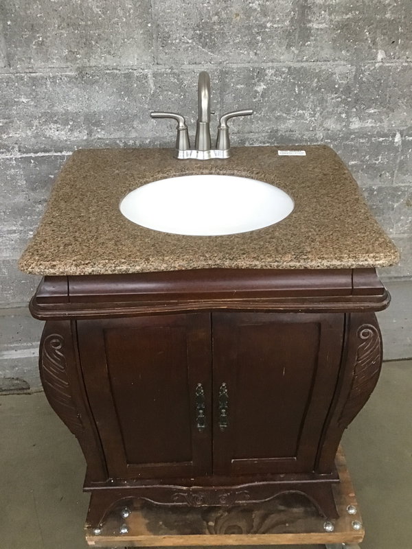 Dark-stained ornate vanity base with faux granite sink top. It has a bit of wear and tear, but should clean up nicely for a new life in your project.