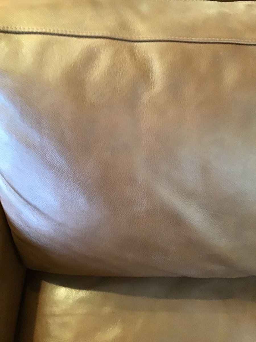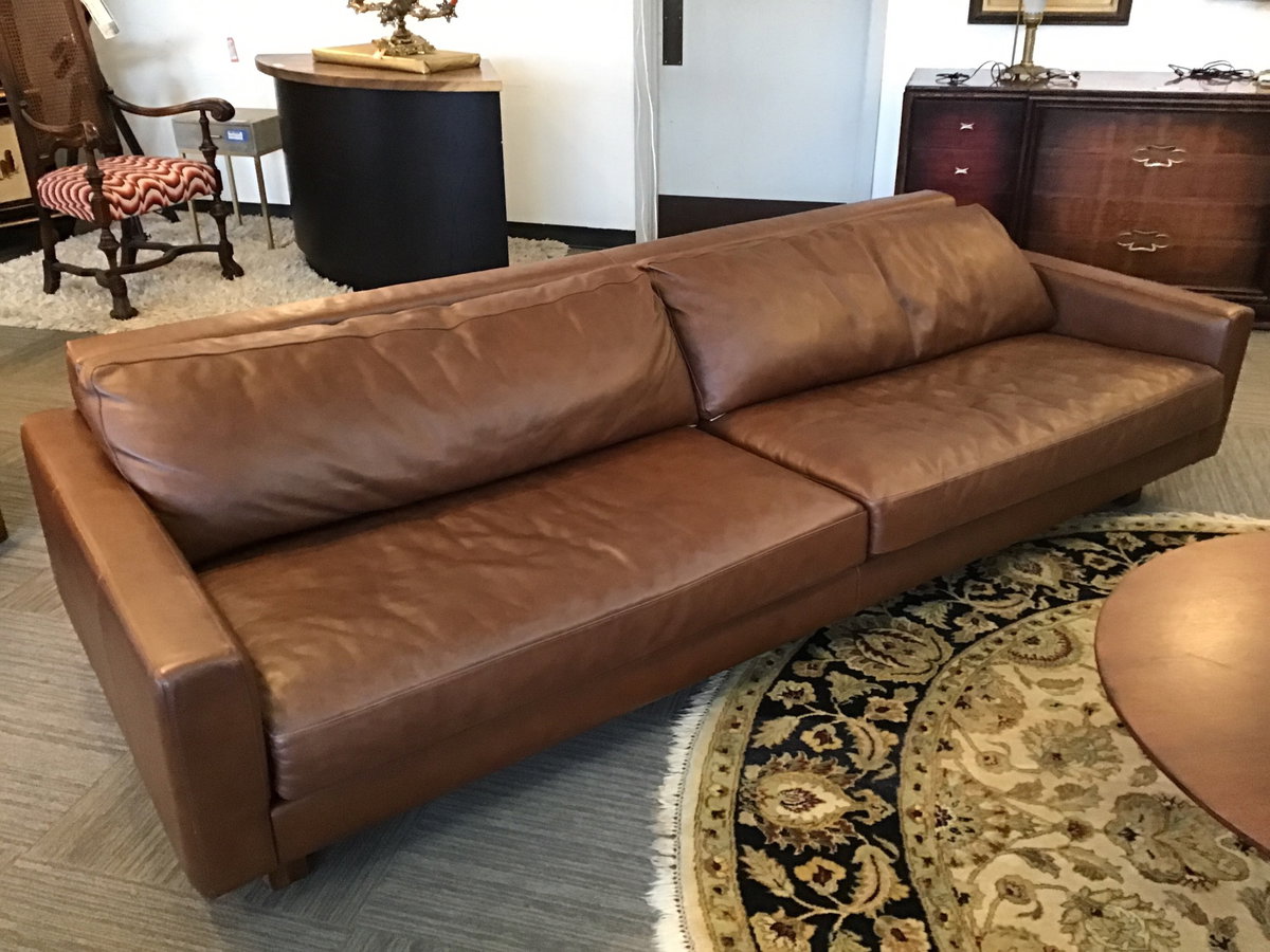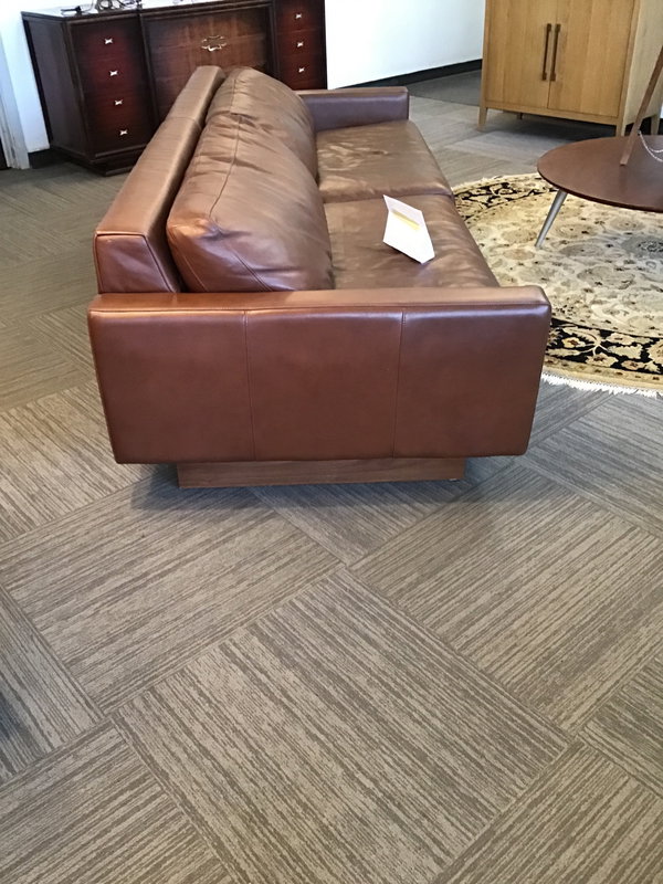 This is a low profile leather couch from Room & Board called the Pierson. This couch has a "Laino Cognoc" colored leather upholstery with walnut finished sled style legs. Overall, the condition is pretty good and hardly any wear. When I sat in this thing it felt pretty damn comfy, which means something, because I have high couch standards. Card carrying member of the Council of Couch Connoisseurs! Original retail over 4k+