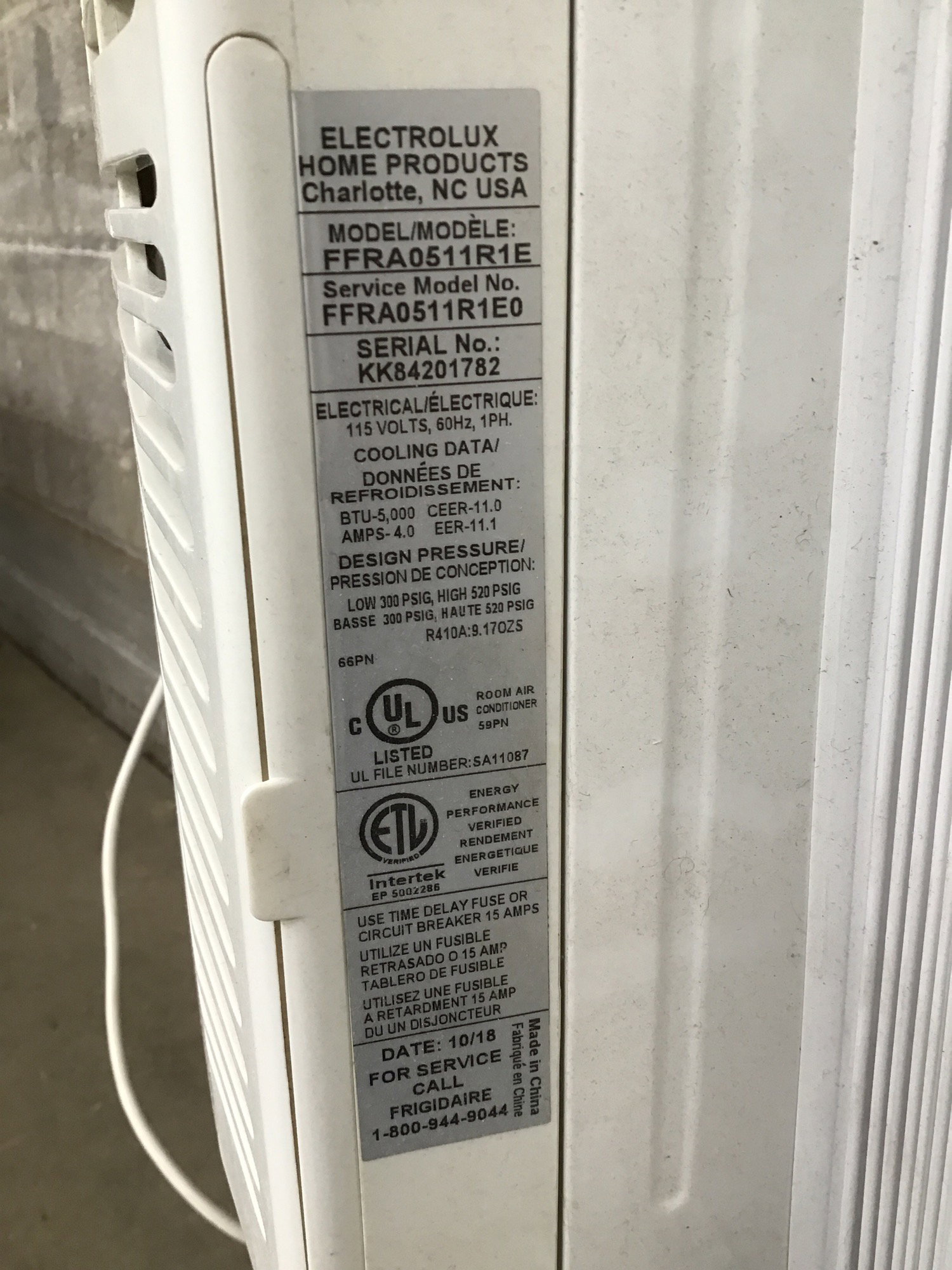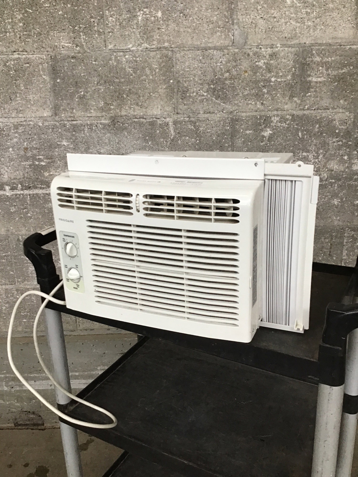 Frigidaire window AC unit circa 2018. Got cool quickly when tested, seems in great shape aside from a little cosmetic peeling around the knobs. Newest comparable model retails for $187 at Home Depository.