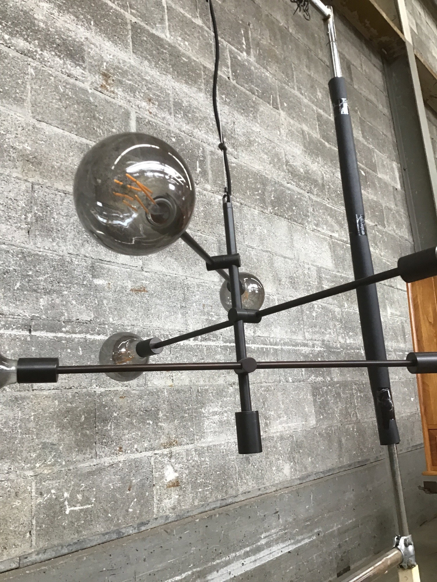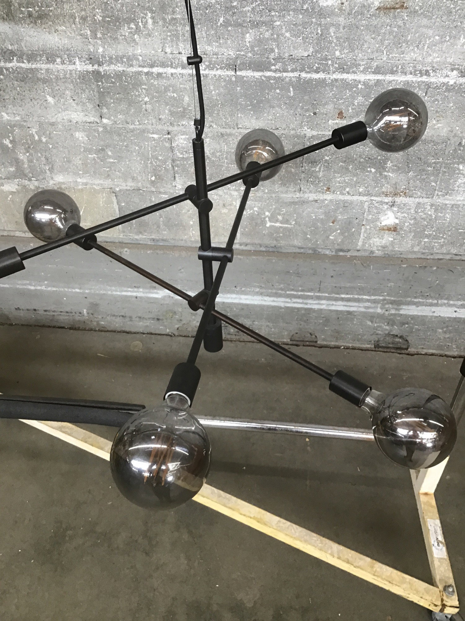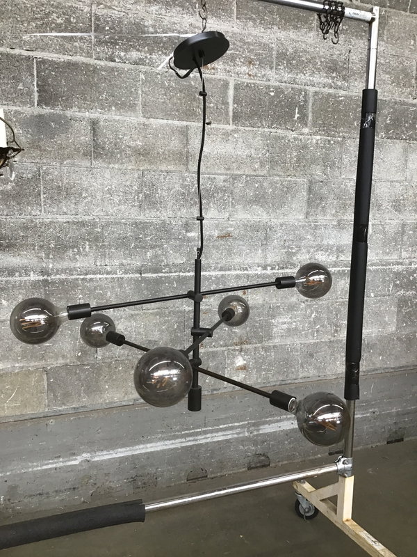 A 6 bulb double-ended stick chandelier that I would generously call Sputnik-esque. Very modern and minimalist with an oil rubbed bronze finish and 6 oversized Edison-style silvered glass bulbs. The arm angles are adjustable, as is the hang length.