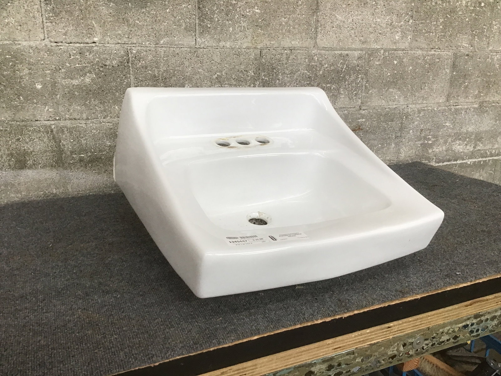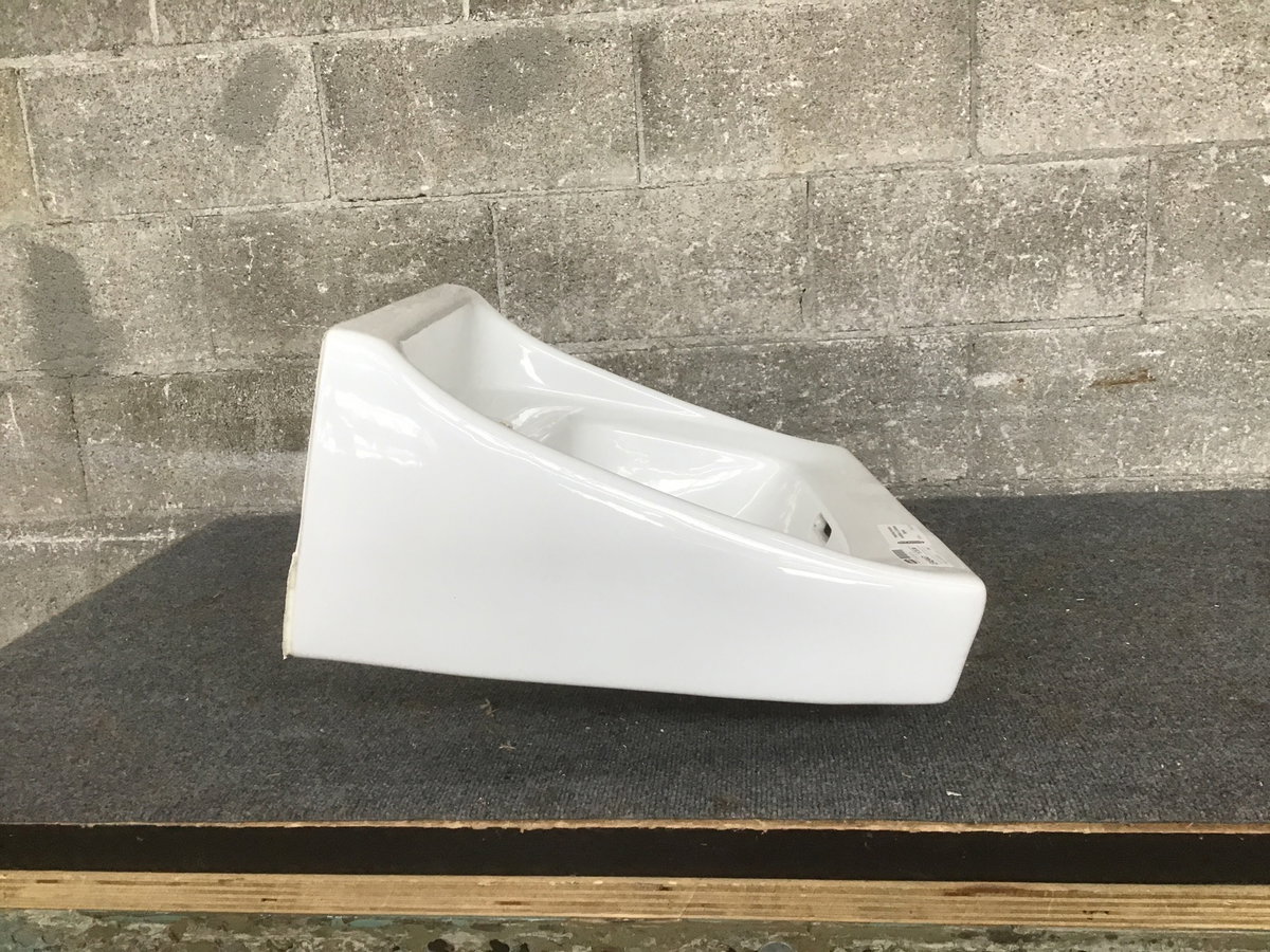 Basic commercial-y wall mount sink from Toto with 3 hole faucet opening. Includes what I'm pretty sure are the correct mounting brackets as they came in together, but if they aren't, we can probably help you find a match!