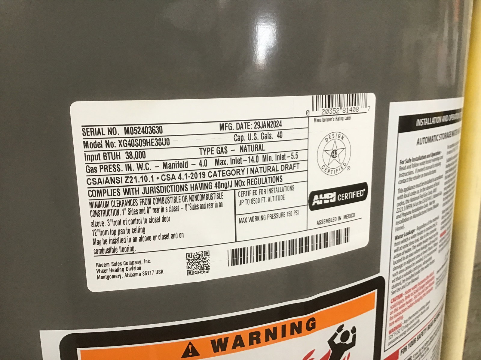 2024 Rheem Gas Water Heater that we are selling as untested but this was made in 2024 so I would be surprised if this did not work for some reason.