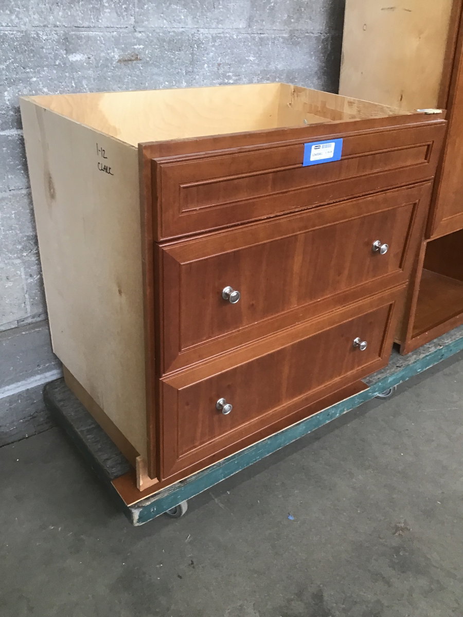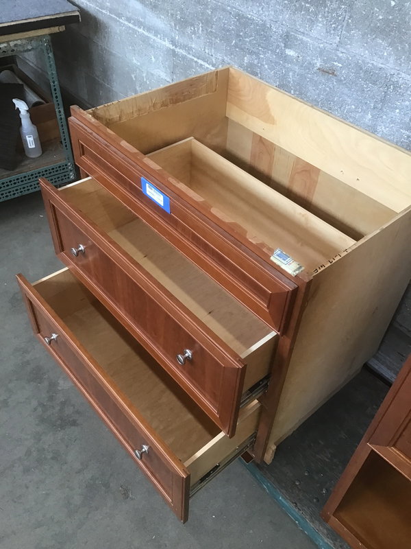 A base cabinet for your home with two large 3/4 extension drawers that're perfectly suited for holding all of your pots and pans and lasagne dishes. With rich cherry facing that sports a recessed panel Craftsman style and polished nickel pulls, this modular beauty will bring a class and cohesion to your renovation! Probably had a cooktop installed behind the top drawer face.