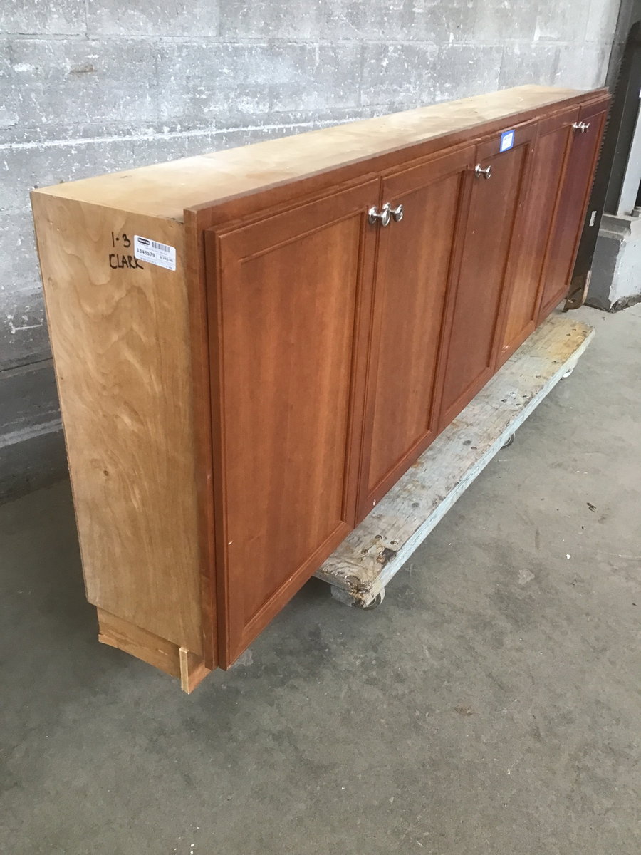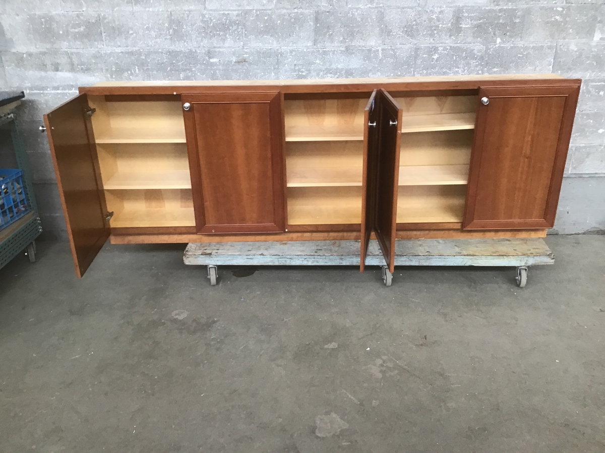 Long and shallow cherry base cabinet with lots of adjustable shelves behind the doors.. With rich cherry facing that sports a recessed panel Craftsman style and polished nickel pulls, this modular beauty will bring a class and cohesion to your renovation!