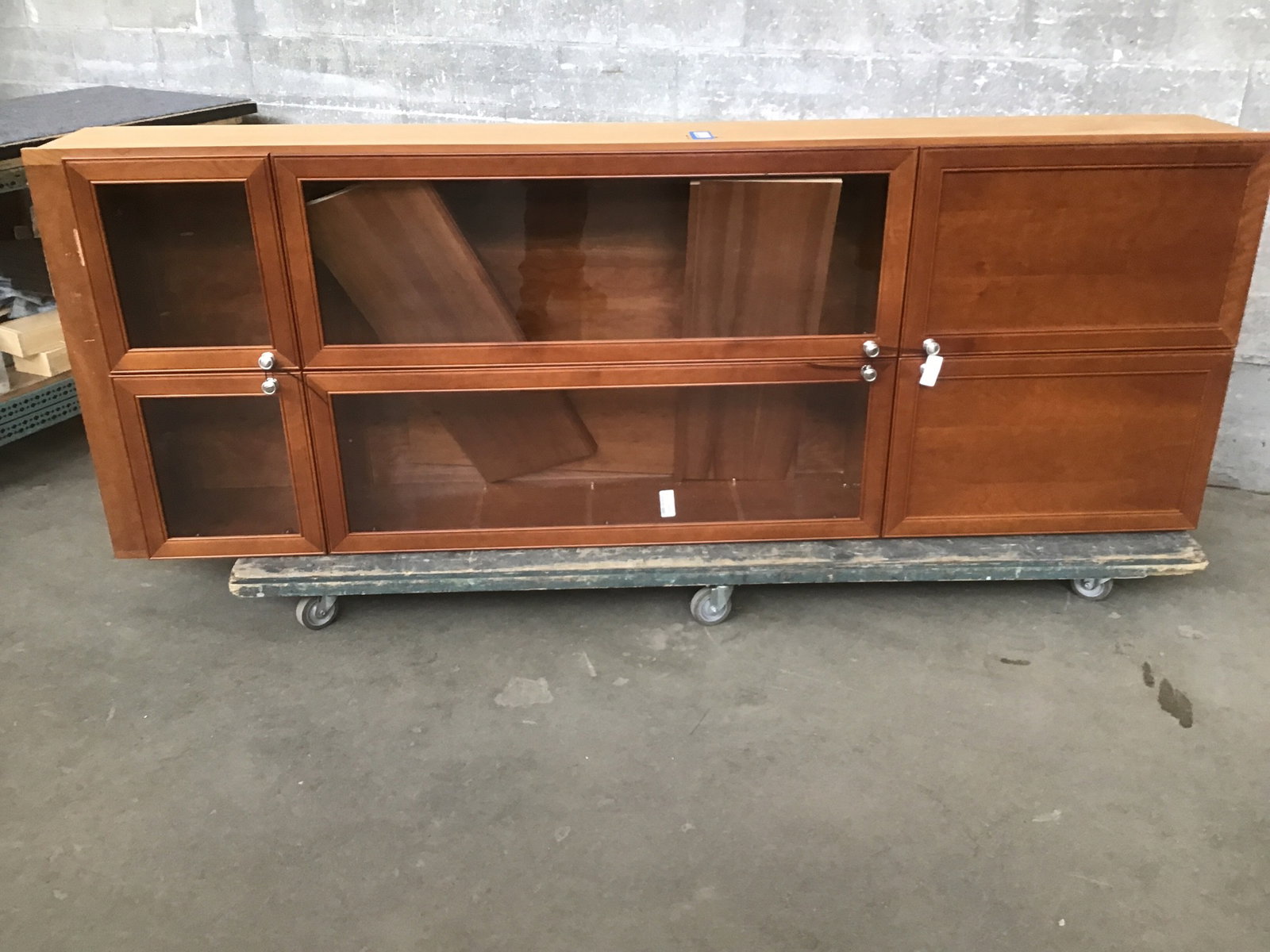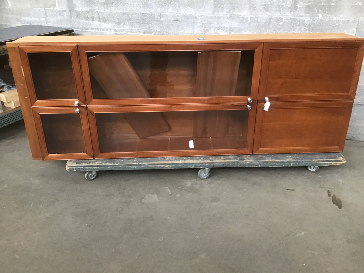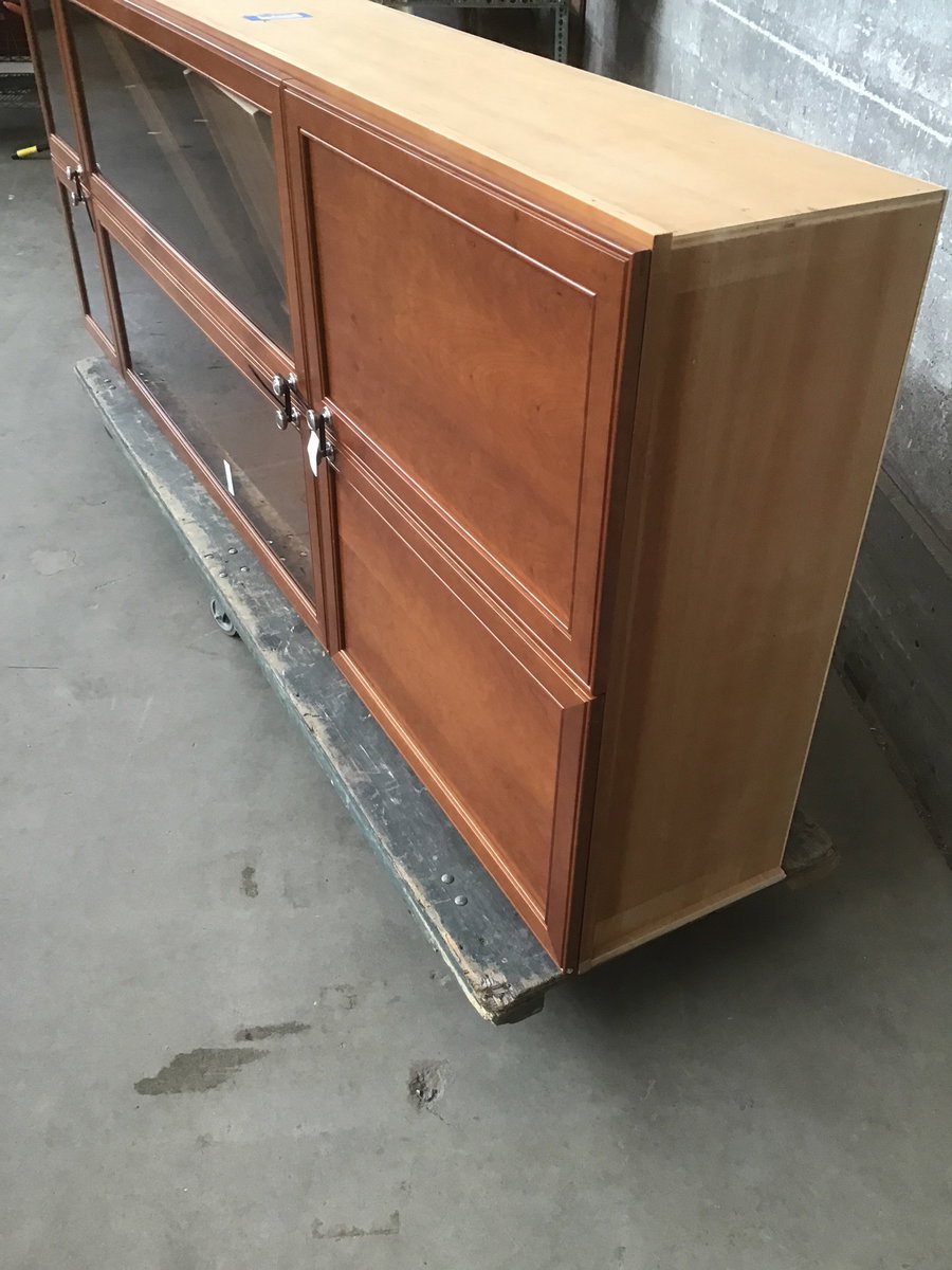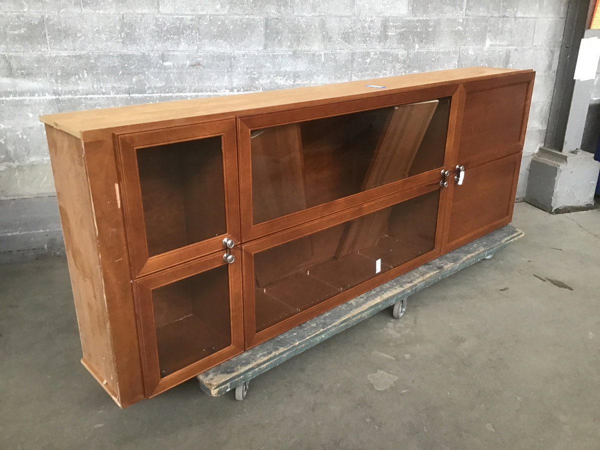 A super-tall pantry cabinet, perfect for your home, with a veritable glut of storage space. The two doors on the bottom side are cherry-faced, with a recessed panel Craftsman-y style to them, while the four other doors, stacking in line above the two wooden ones, feature bevel-edge glass panes with adjustable-height shelving that matches the face inside, perfect for displaying the fancier pieces of diningware and cutlery you've collected over the years. This baby's pretty tall and shallow, so we've had to photo it on its side to reduce any falling hazards, so you'll need to make sure and secure it tight to your wall!