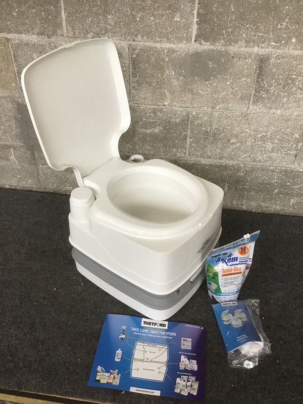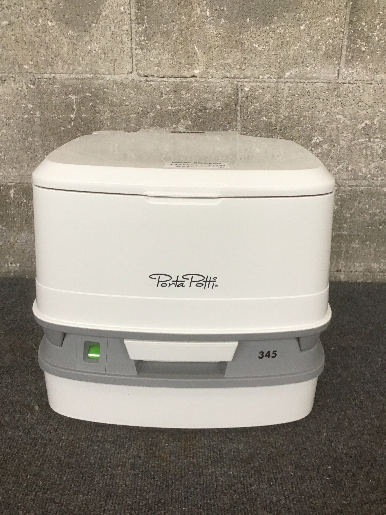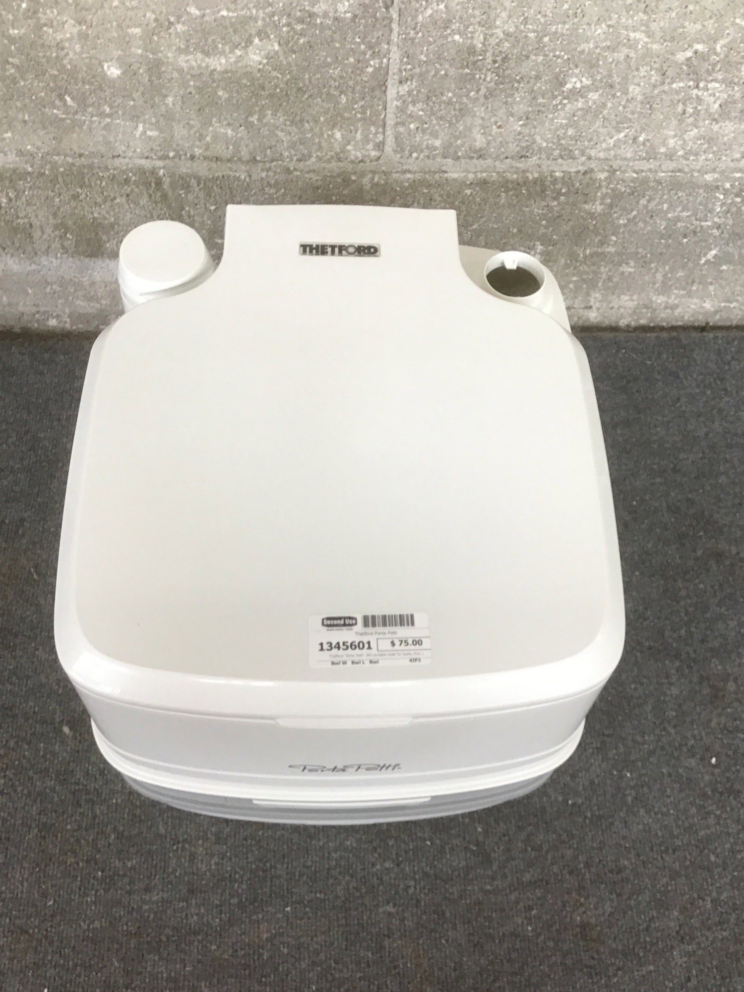 Thetford "Porta Potti" 345 portable toilet for boats, RVs, cabins, etc. Brand spankin' new, never seen the backside of a sailor! Has a latching lid, pump flush, and waste level indicator. Big upgrade from the 5 gallon bucket setup! Retails for $145 online.
