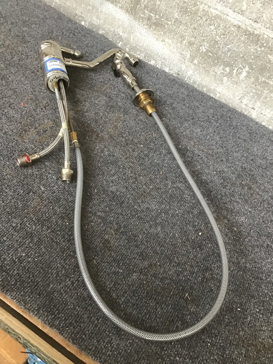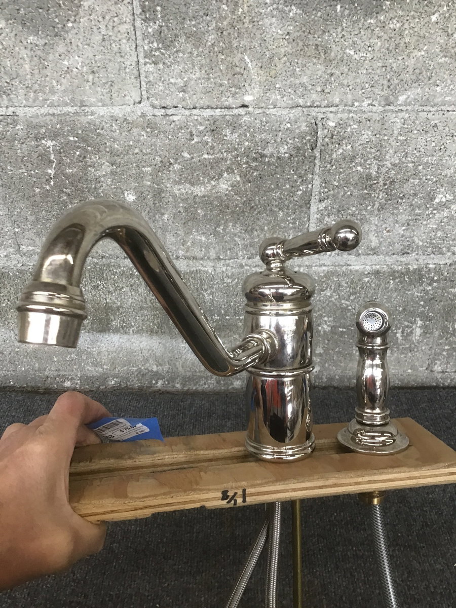 A fancy and classy-looking kitchen faucet with a gooseneck and a detached spray nozzle- old style. Bring a bit of old world flair into your home kitchen with this beaut!