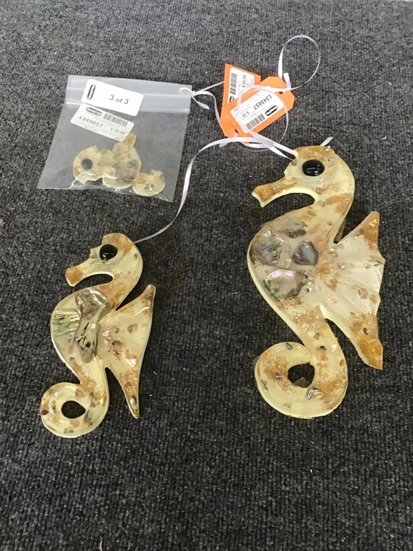 A cute(?) bug-eyed trio of midcentury lucite acrylic seahorses with gold specks and shimmery abalone shells cast inside. These little guys are a bit brittle and it looks like each one has suffered fractures at one point or another (the baby is in 3 pieces right now :'c), but they're simple fixes and could grace your walls for years to come with a little TLC!