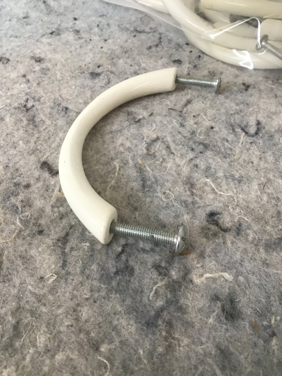 3.75" between bolt centers. 10 porcelain cabinet pulls in good condition, but might need to be cleaned up. Screws included. Photos may be representational.