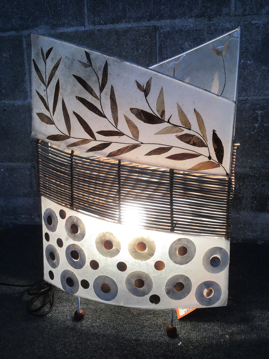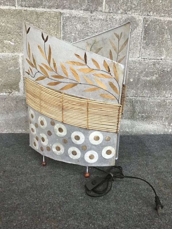 Tropical vibe table lamp that uses bamboo and shoji screen like material to diffuse the light from a single bulb. Cord has a switch.