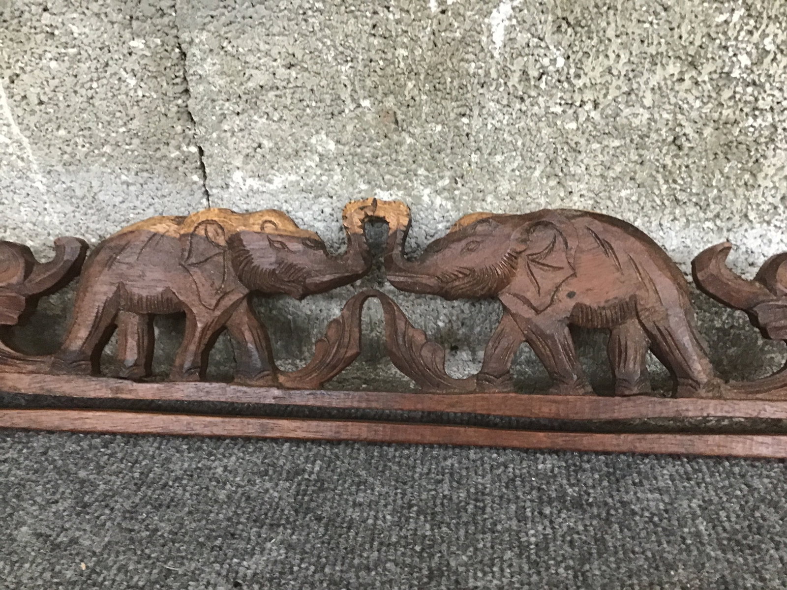 Piece of tropical hardwood that is carved with two elephants meeting in the middle.