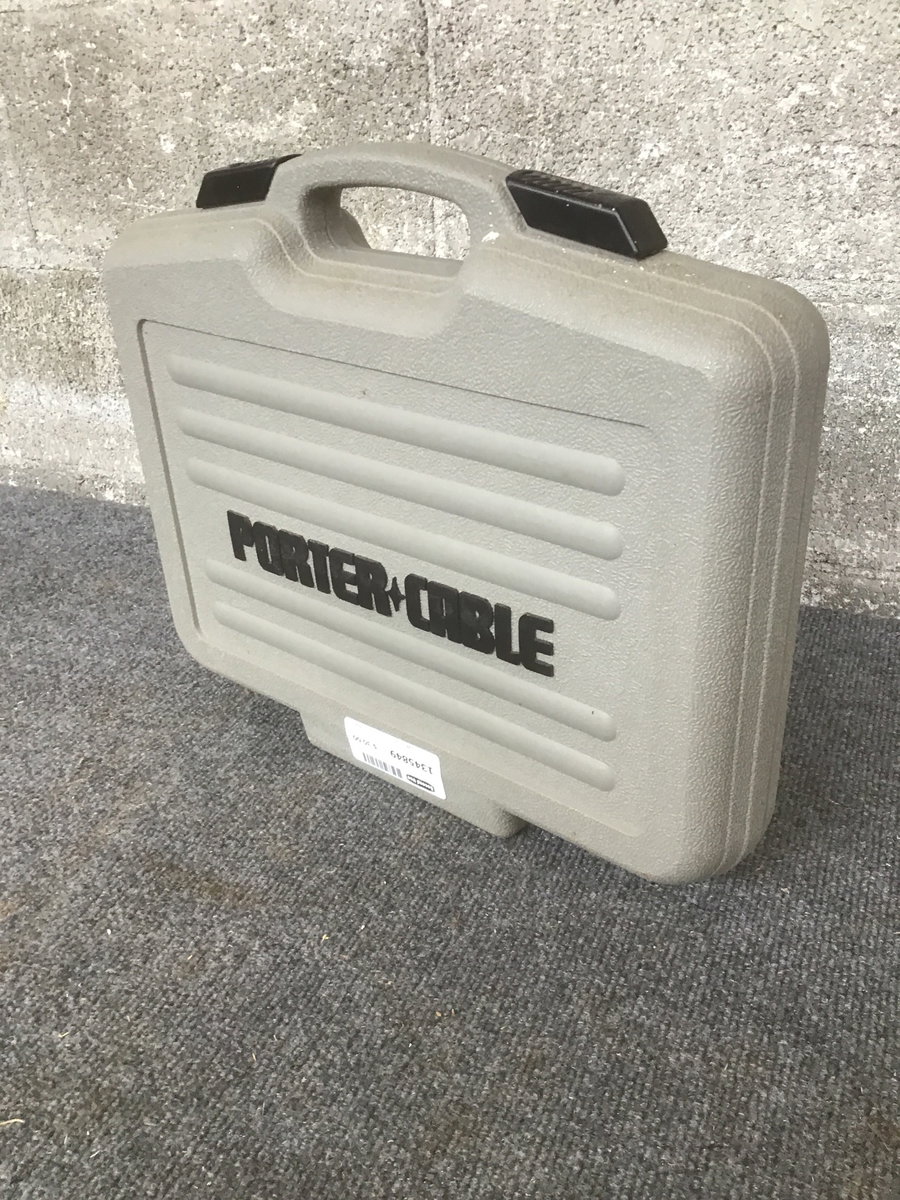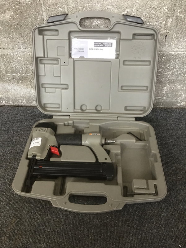 A medium gray brad nail gun by Porter Cable. Comes in a gray hard plastic case and includes a manuel.