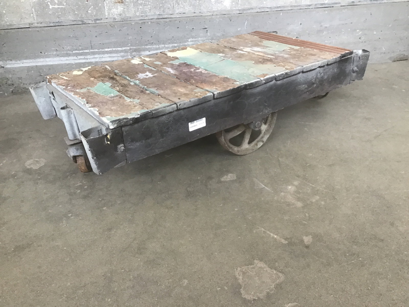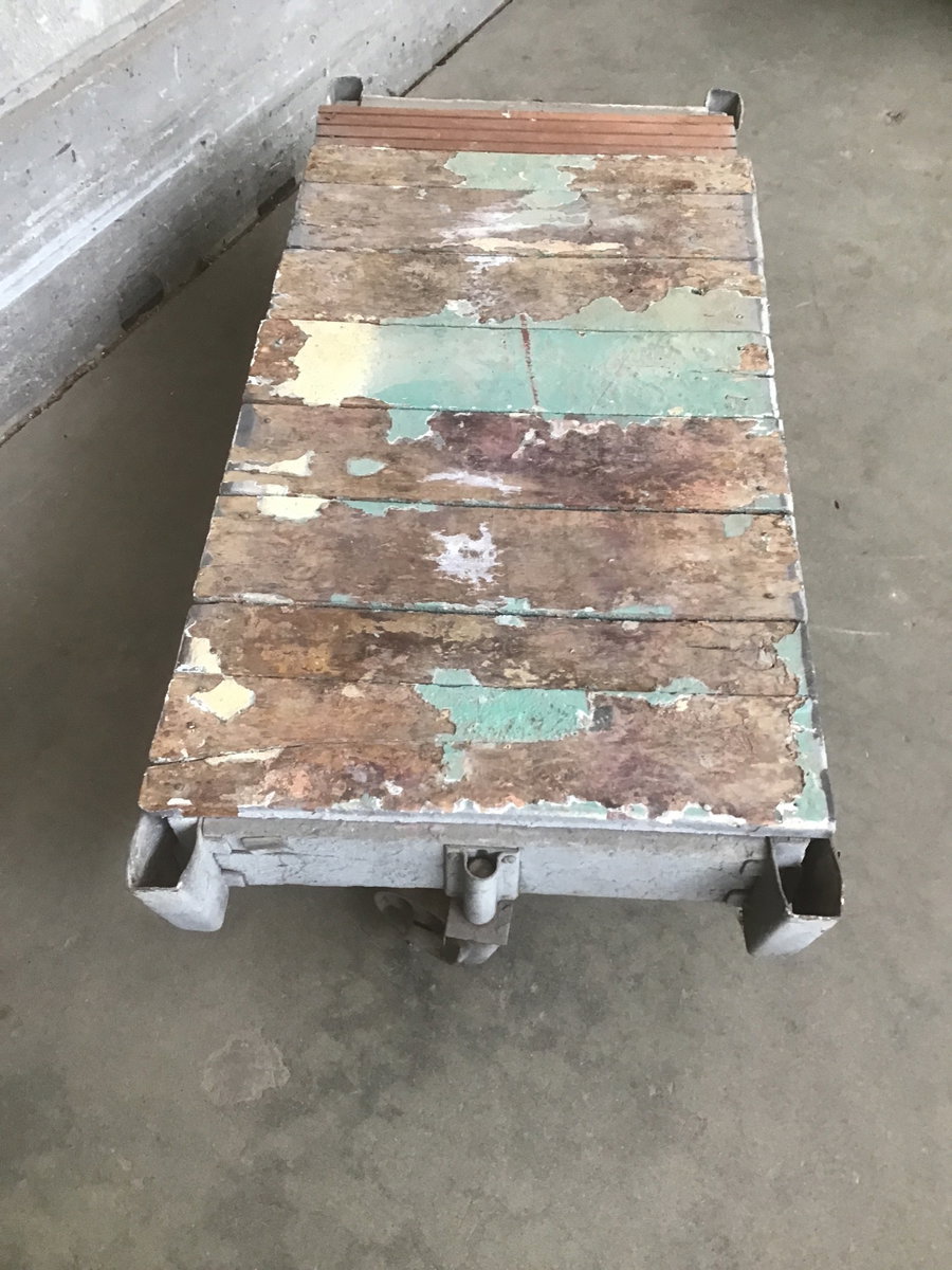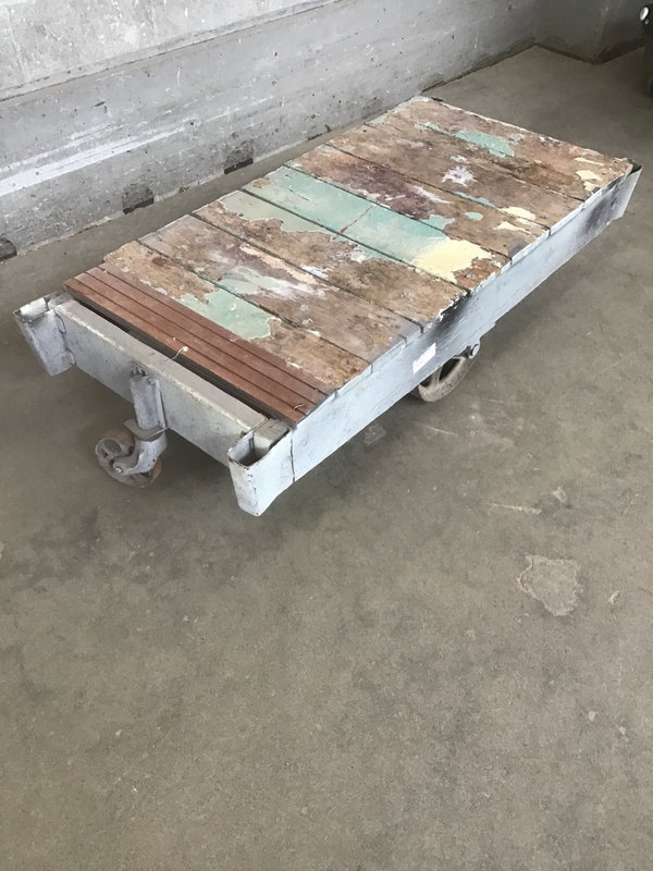 The top deck of this vintage, heavy duty, steel wheeled lumber cart is still there (mostly rid of the layers of paint that were upon it). You could still haul a heavy load with this one or maybe clean up a bit more and replace a board or two to have a great Industrial Chic coffee table.