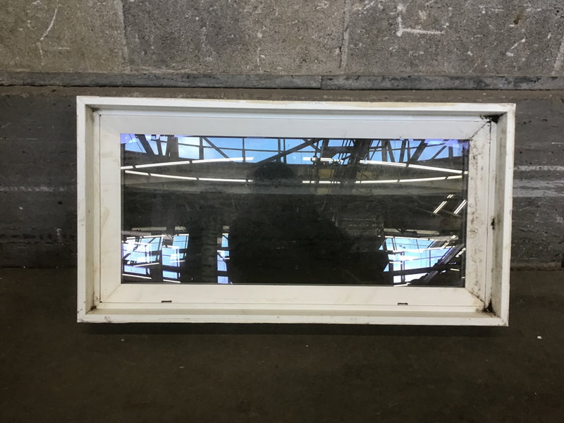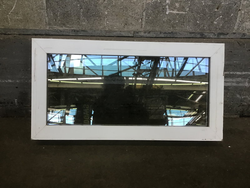 A white vinyl fixed window with thermopane glass. This window has see its share of use, but could be used again as a window for a below ground dwelling.