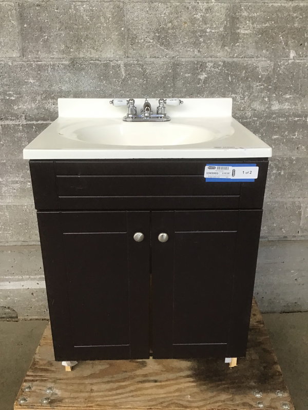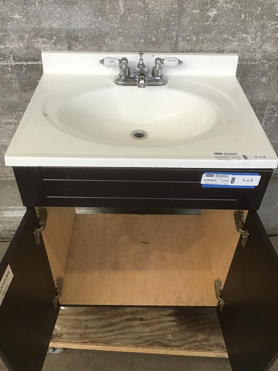 Basic bath vanity in decent shape, the moulded resin sink has some cosmetic issues, price reflects.