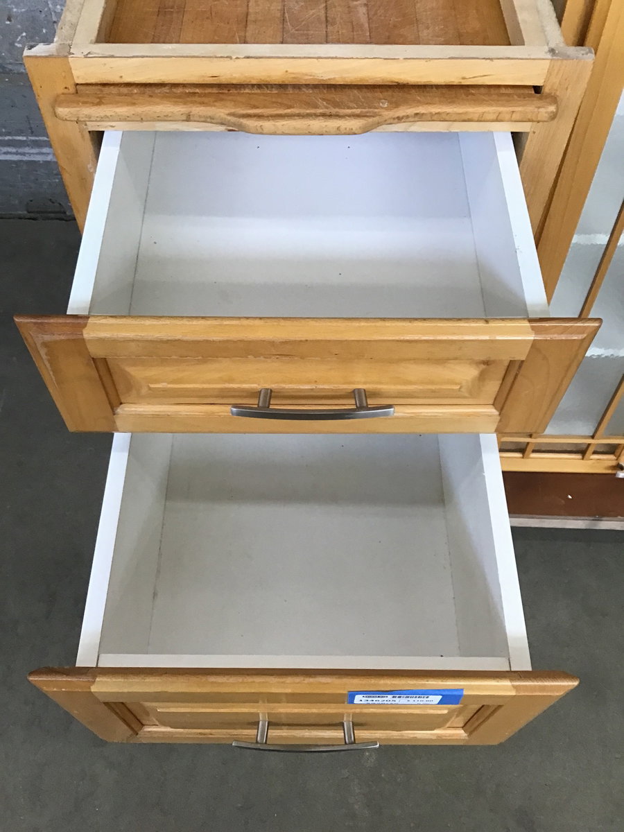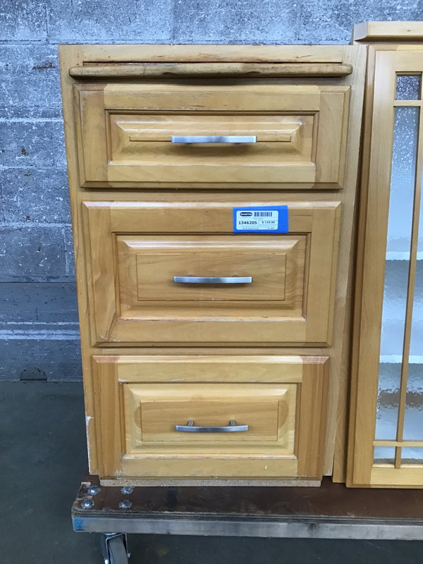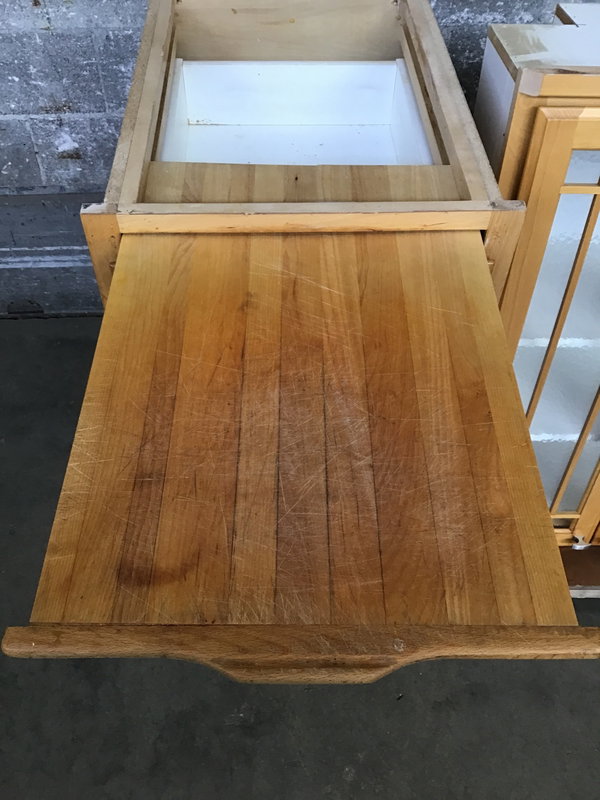 Maple raised panel drawer base with cutting board. Light stain finish. In good used condition.