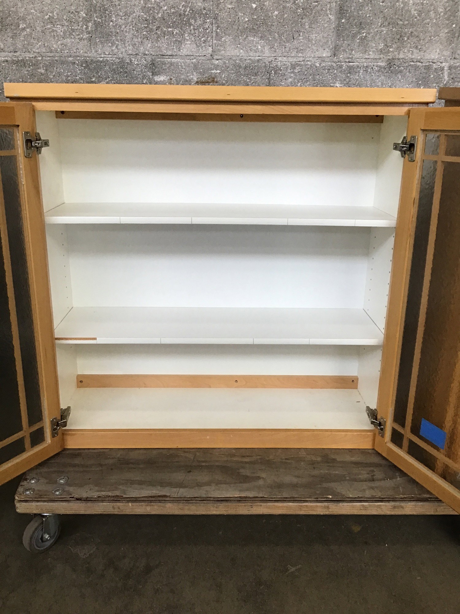 Light-stained maple upper cabinet with craftsman style glass doors.